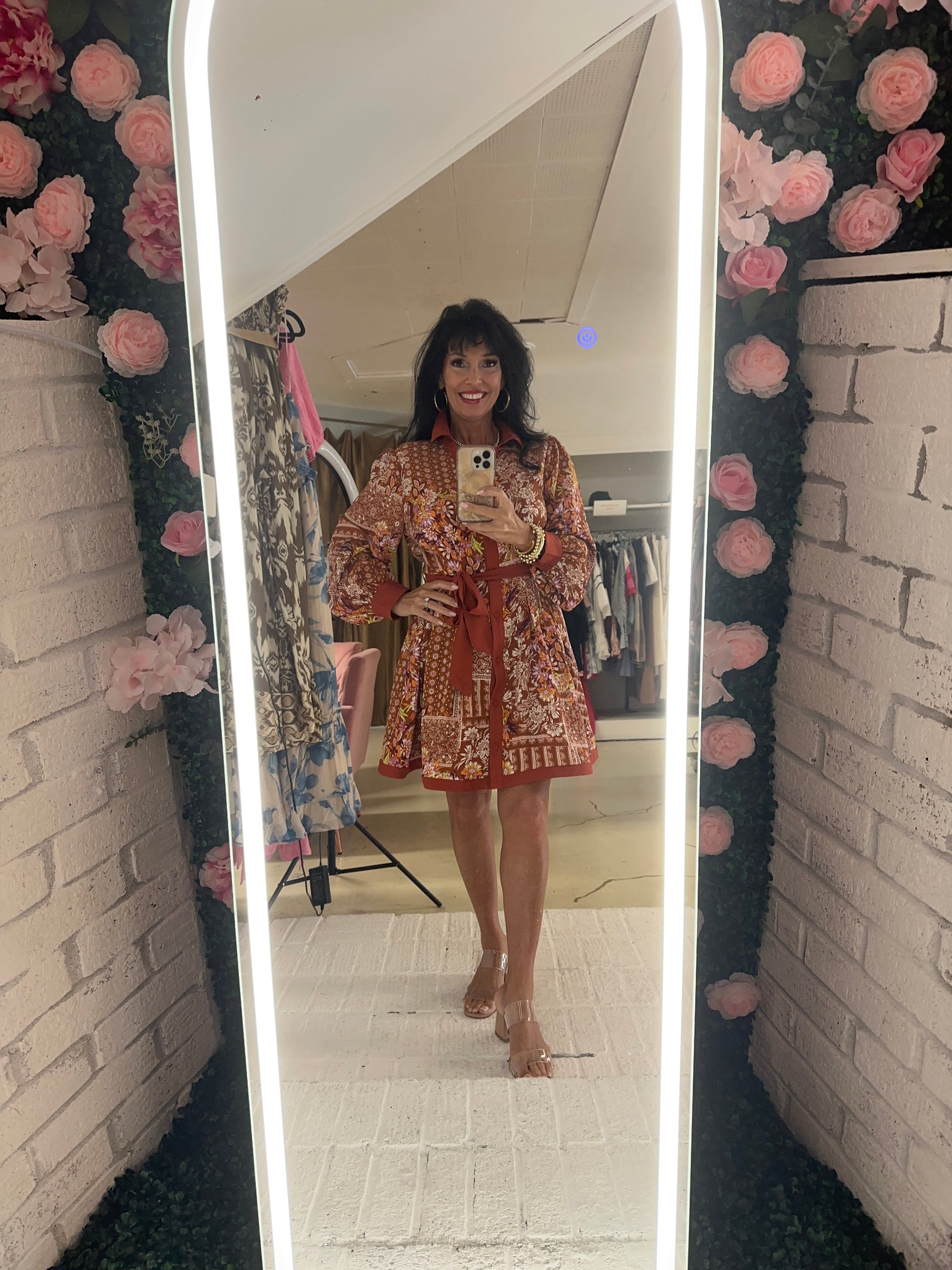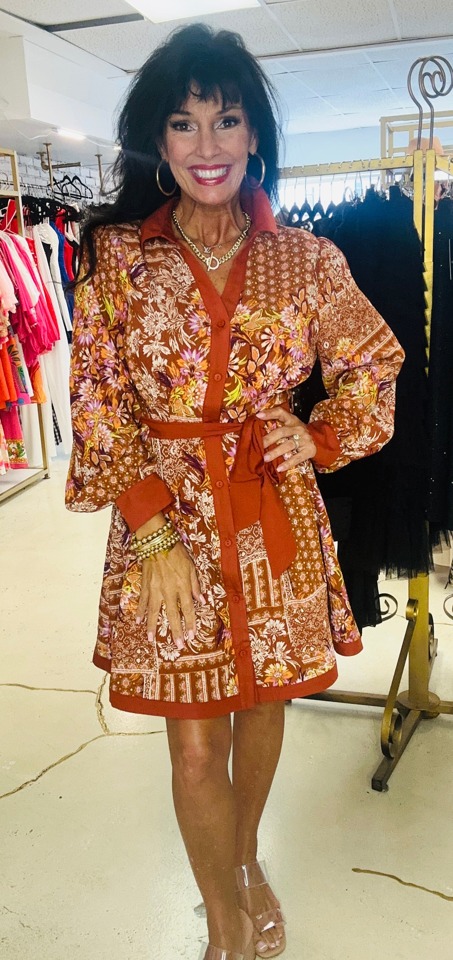 Step into effortless style with our Autumn Leaves Shirt Dress! Featuring a rich rust base with a vibrant floral patchwork print, this dress brings the perfect mix of retro charm and modern flair. The collared neckline, button-down front, and waist tie give it a flattering, polished look while the flowy fit and balloon sleeves keep it fun and comfortable. Dress it up with boots or keep it casual with sneakers—either way, you’ll be styled to a tee!