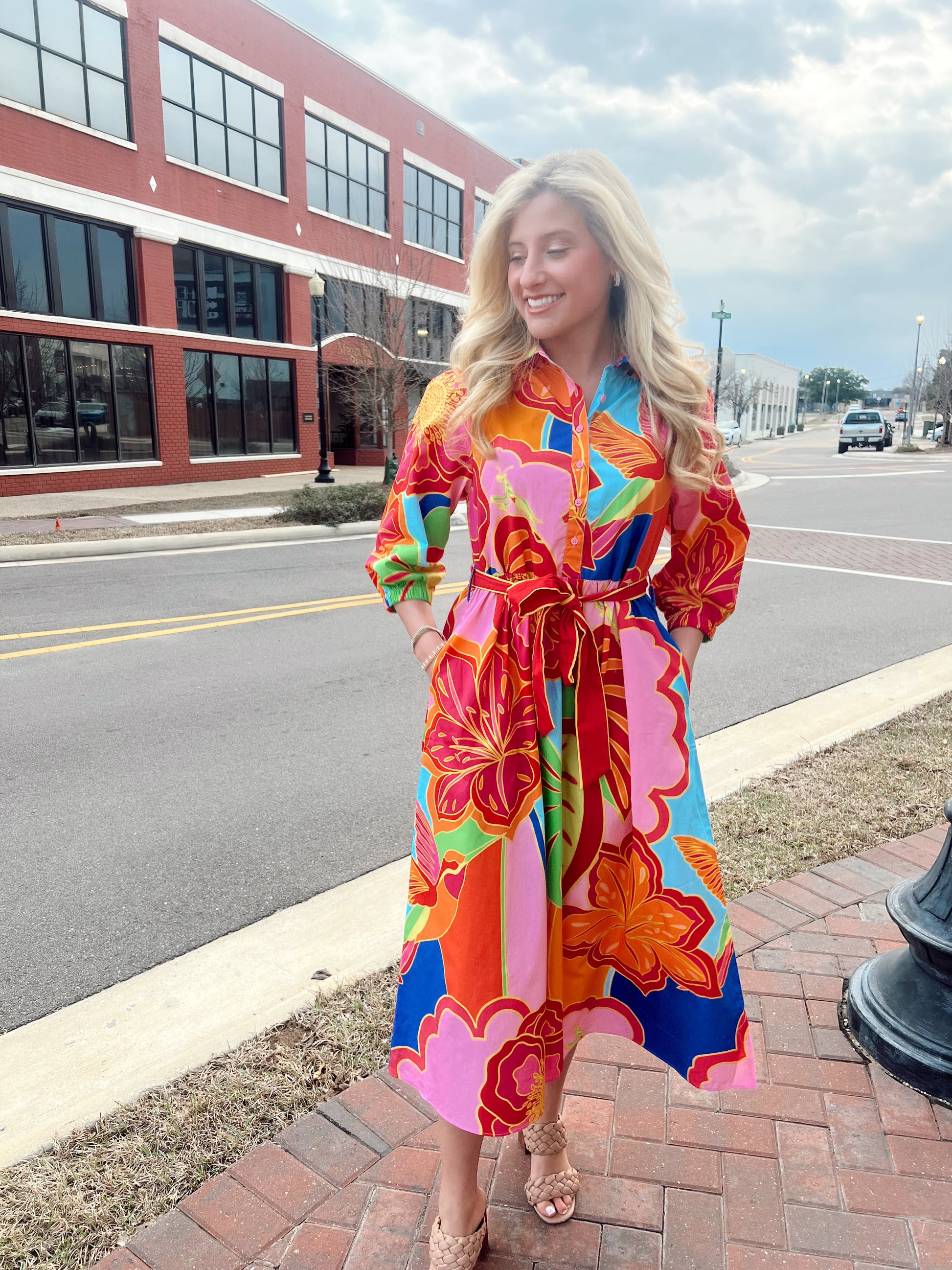 This dress is a Statement piece in your Spring/Summer Wardrobe. Absolutely gorgeous bright color combination in Floral print. Beautiful lines in a midi length with3/4 length sleeves. With a belted waist.