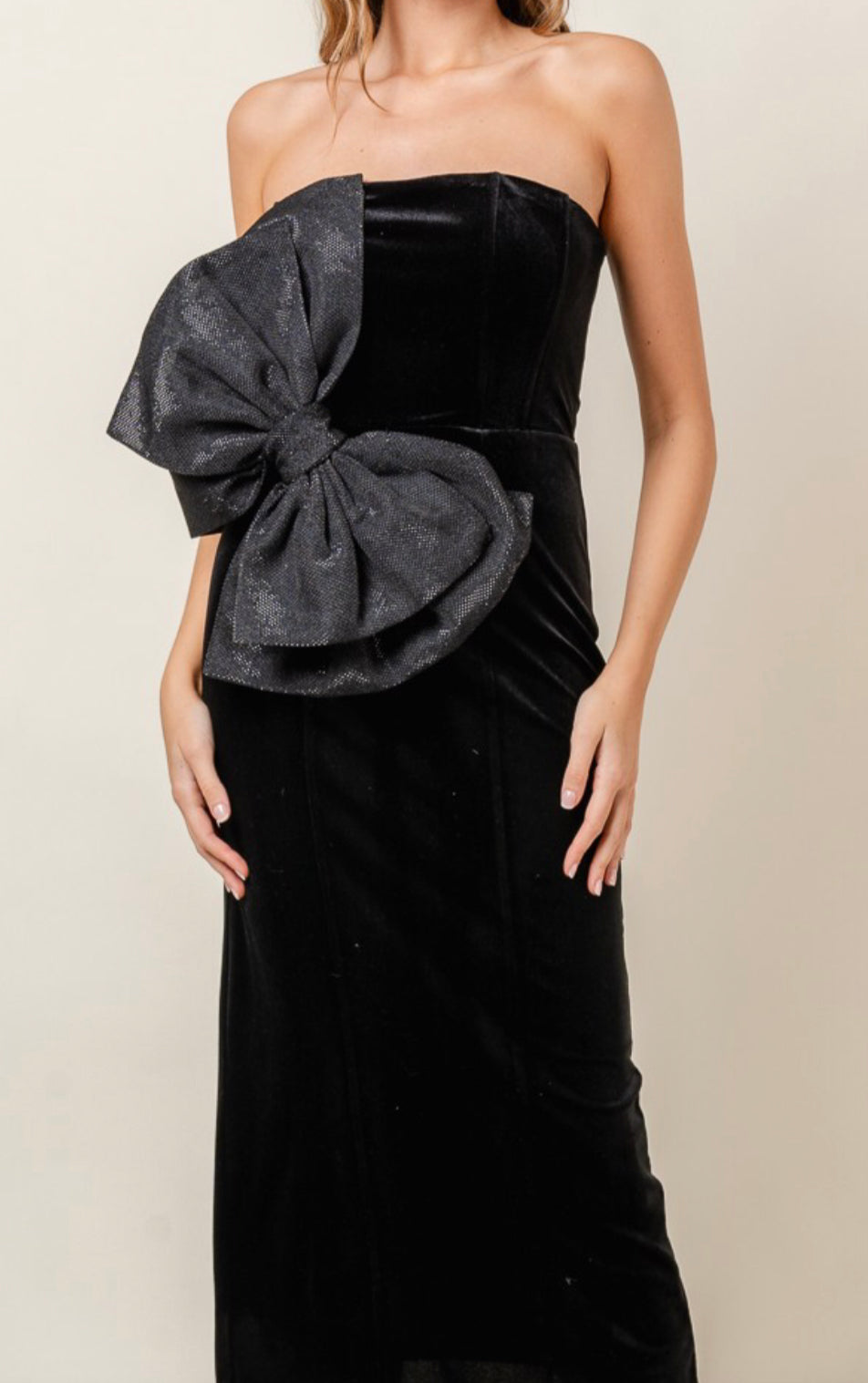 PARTY DRAMATIC BOW VELVET LACEUP TUBE MIDI DRESS TUBE STYLE DRAMATIC FRONT SIDE BOW LACEUP BACK DETAIL SPLIT BACK LOWER SKIRT PORTION