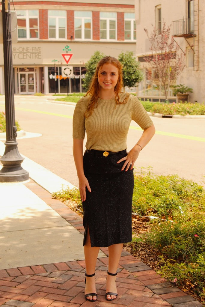 This stunning black midi skirt is a must-have for your wardrobe! Featuring a soft tweed texture with subtle sequin sparkle throughout, it adds the perfect touch of glam while keeping it classy. The sleek black belt with a gold rose buckle cinches the waist for a flattering silhouette. Pair it with a fitted blouse or a cozy knit for a timeless, elegant look.