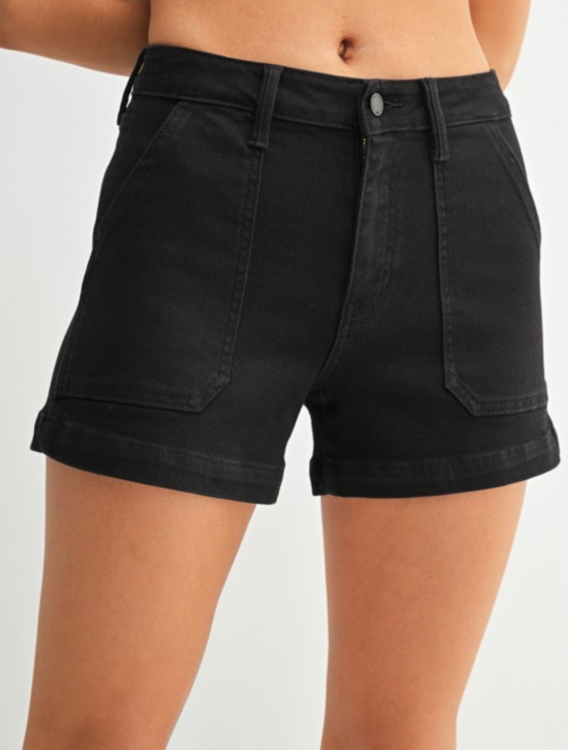 These cute shorts have a fun utility pocket on the front with a front zip. They have lots of stretch for a comfortable fit.