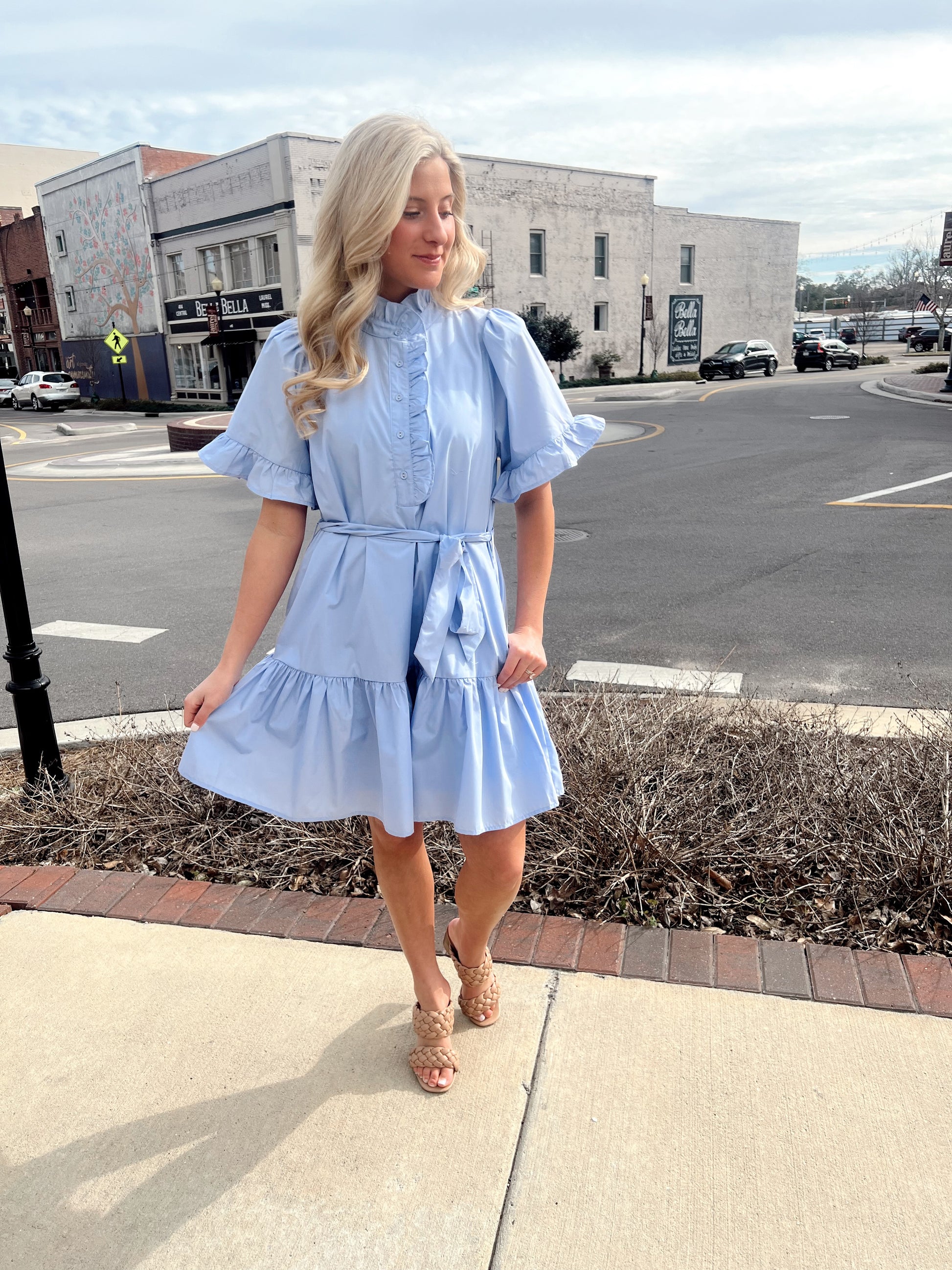 This is a beautiful color blue dress. It has a ruffle at the collar and trim. It has a button up top and ties at the waist. It’s a short puff sleeve and is a moderate length.