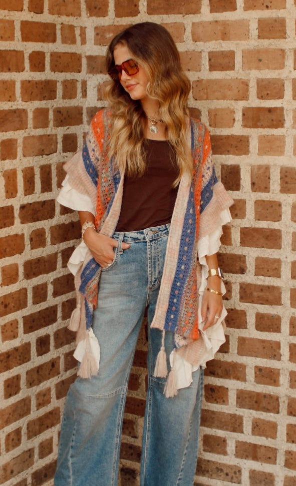 This vibrant sweater features a lightweight, open-front design with a colorful striped pattern in hues of orange, blue, and cream. The intricate crochet-like texture adds a bohemian flair, while the fluttery sleeves and tassel details enhance its playful charm. Perfect for layering over a simple outfit, this piece is ideal for both casual outings and beach days.