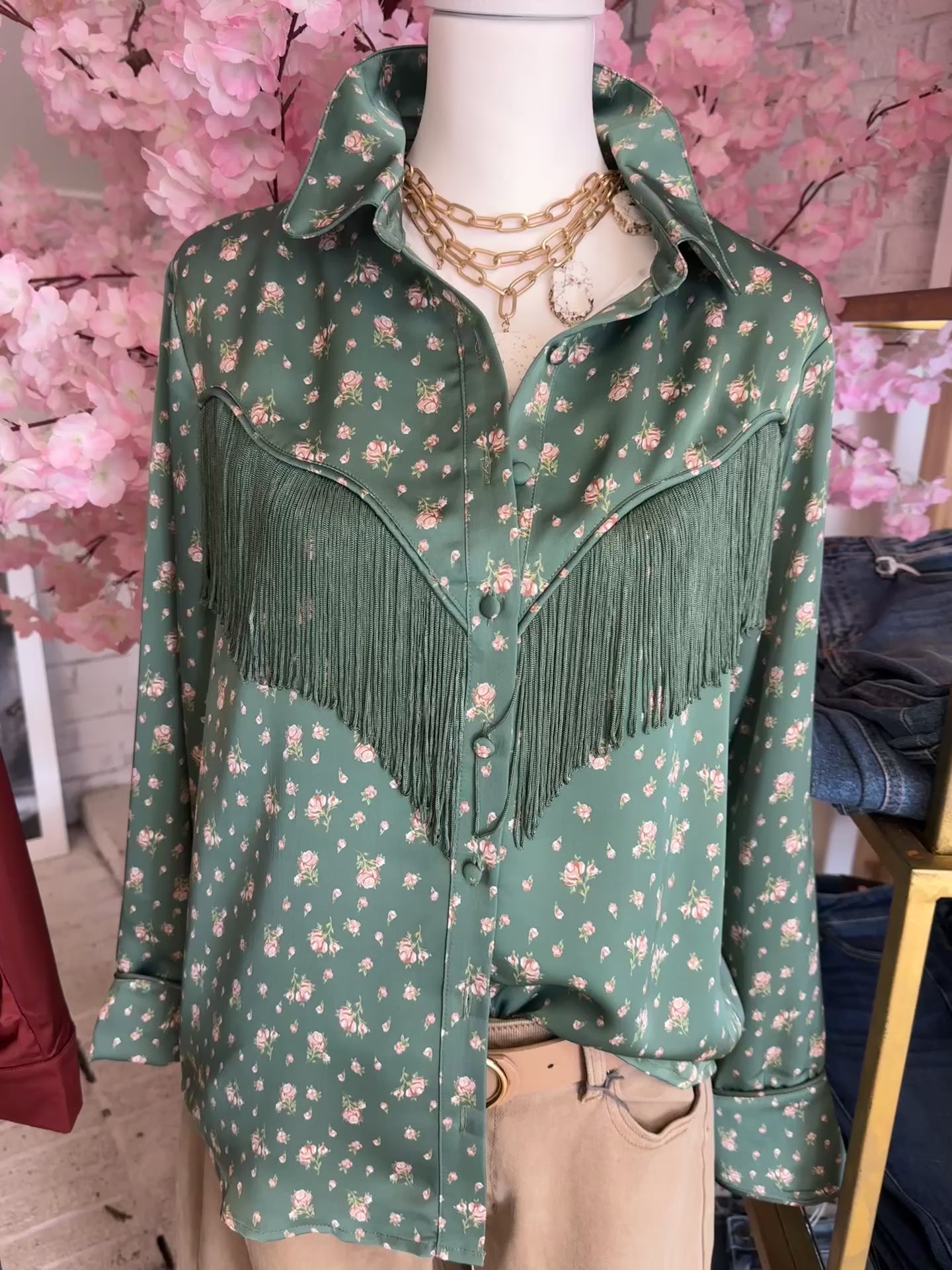 This top is a stylish, floral-patterned blouse in a soft green shade. It features a classic button-up design with a collar and long sleeves, complemented by decorative fringe along the yoke, adding a touch of western flair. The floral print consists of small, delicate flowers that enhance its feminine. Super Cuteππ