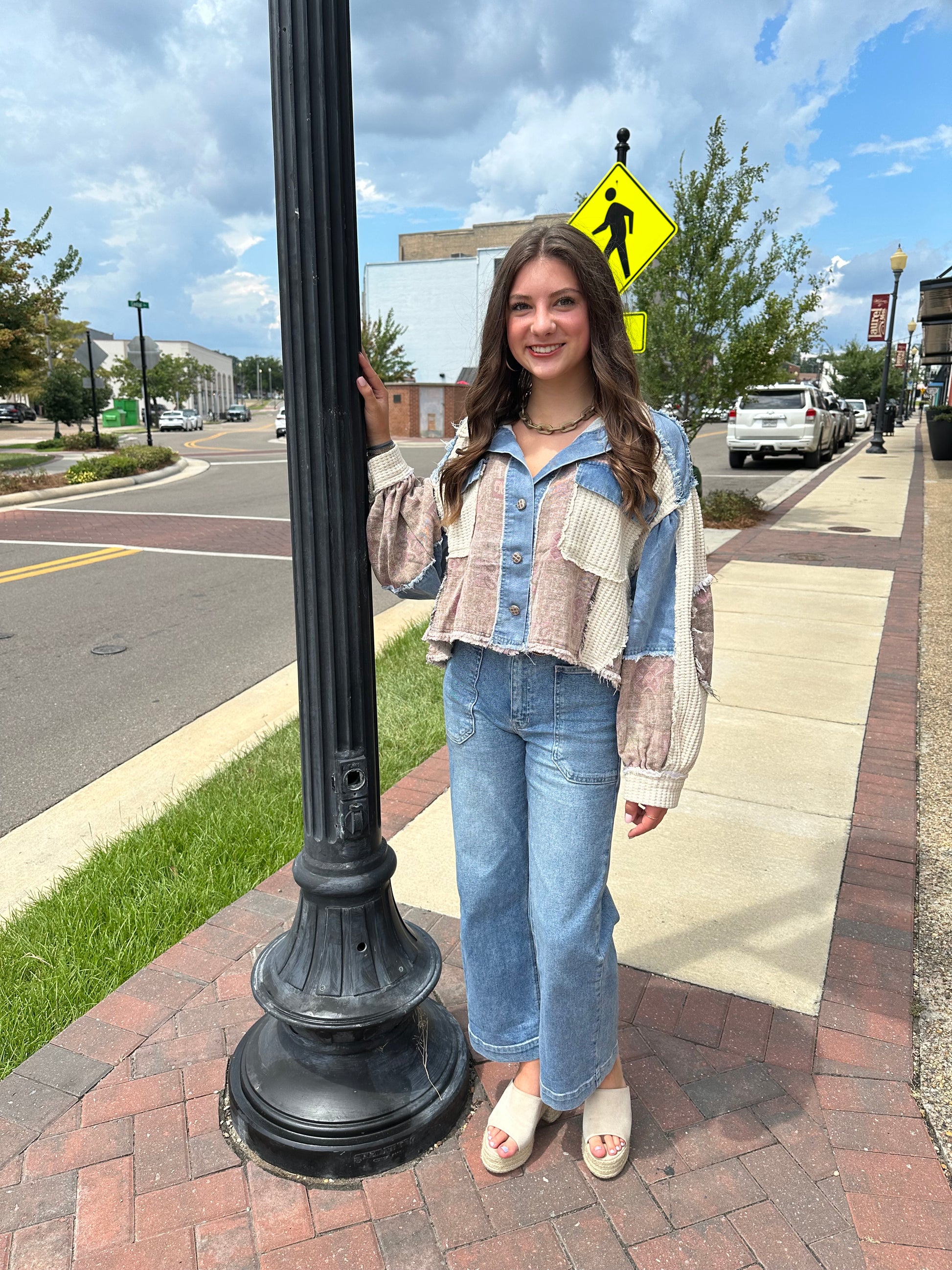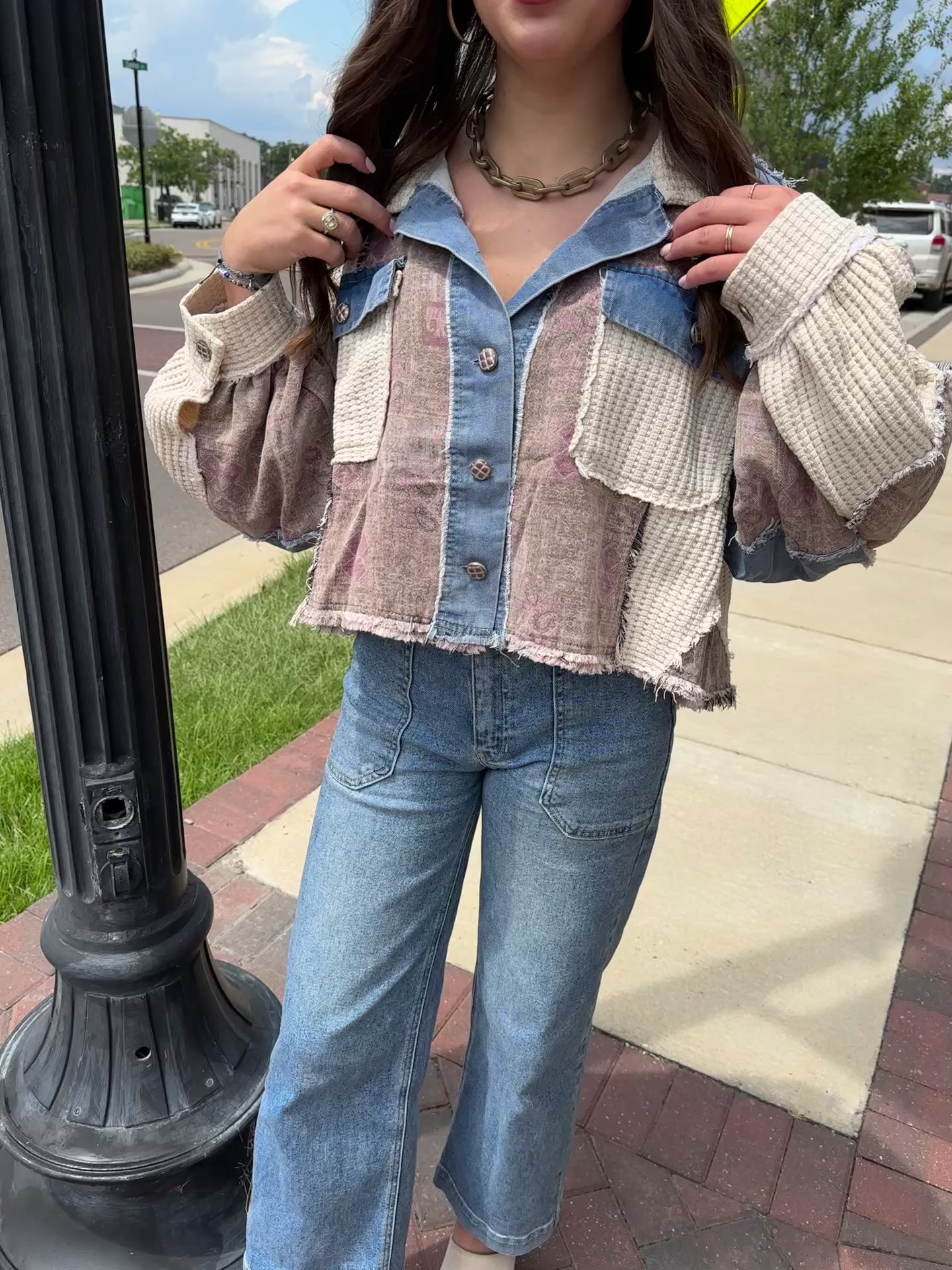 This jacket is a unique, eclectic design, featuring a combination of textures and fabrics, including denim and woven elements. Its oversized fit, with a cropped silhouette and button-up front, adds a casual and trendy vibe. The contrasting patches and pockets provide a playful, bohemian flare.