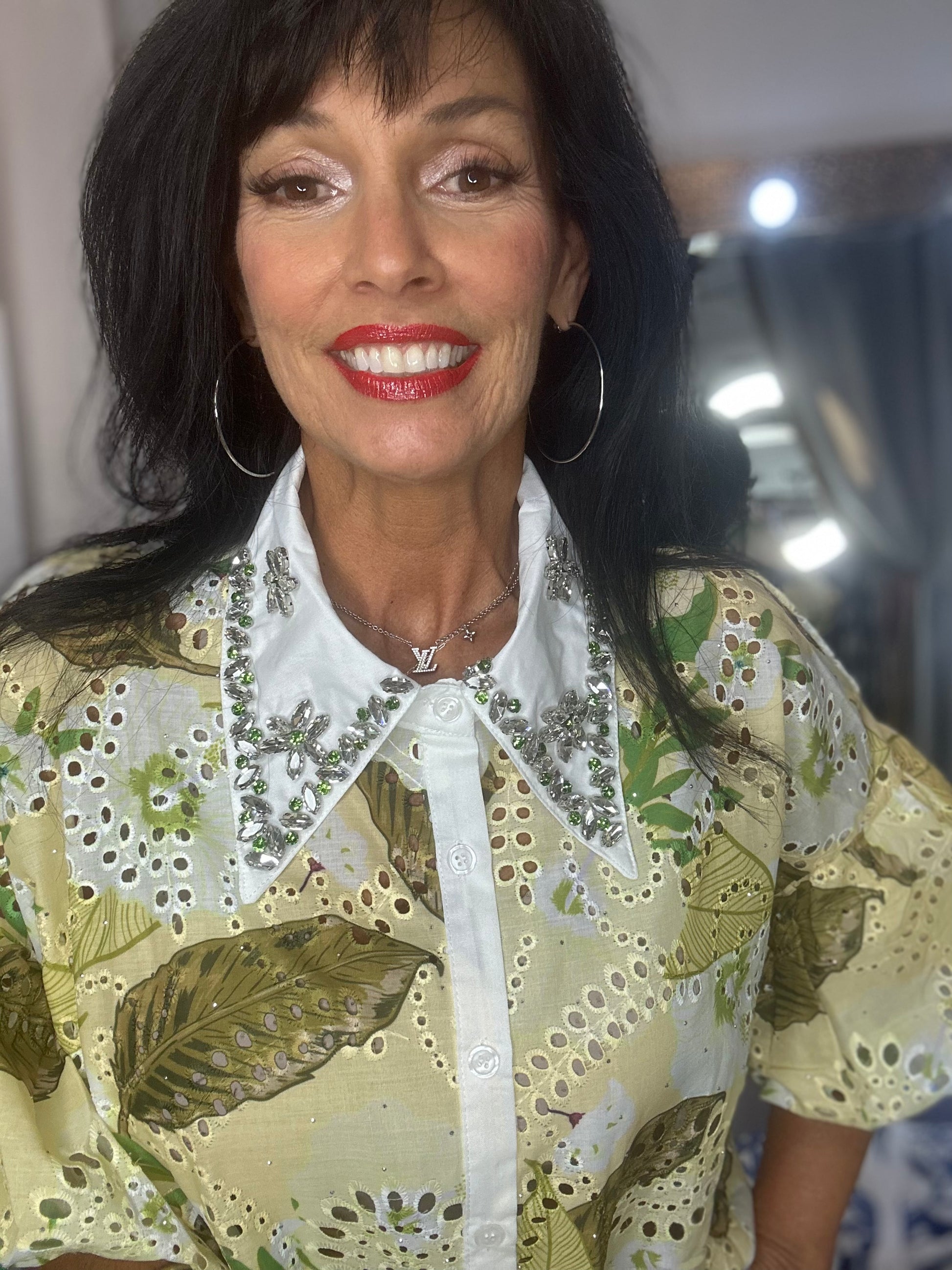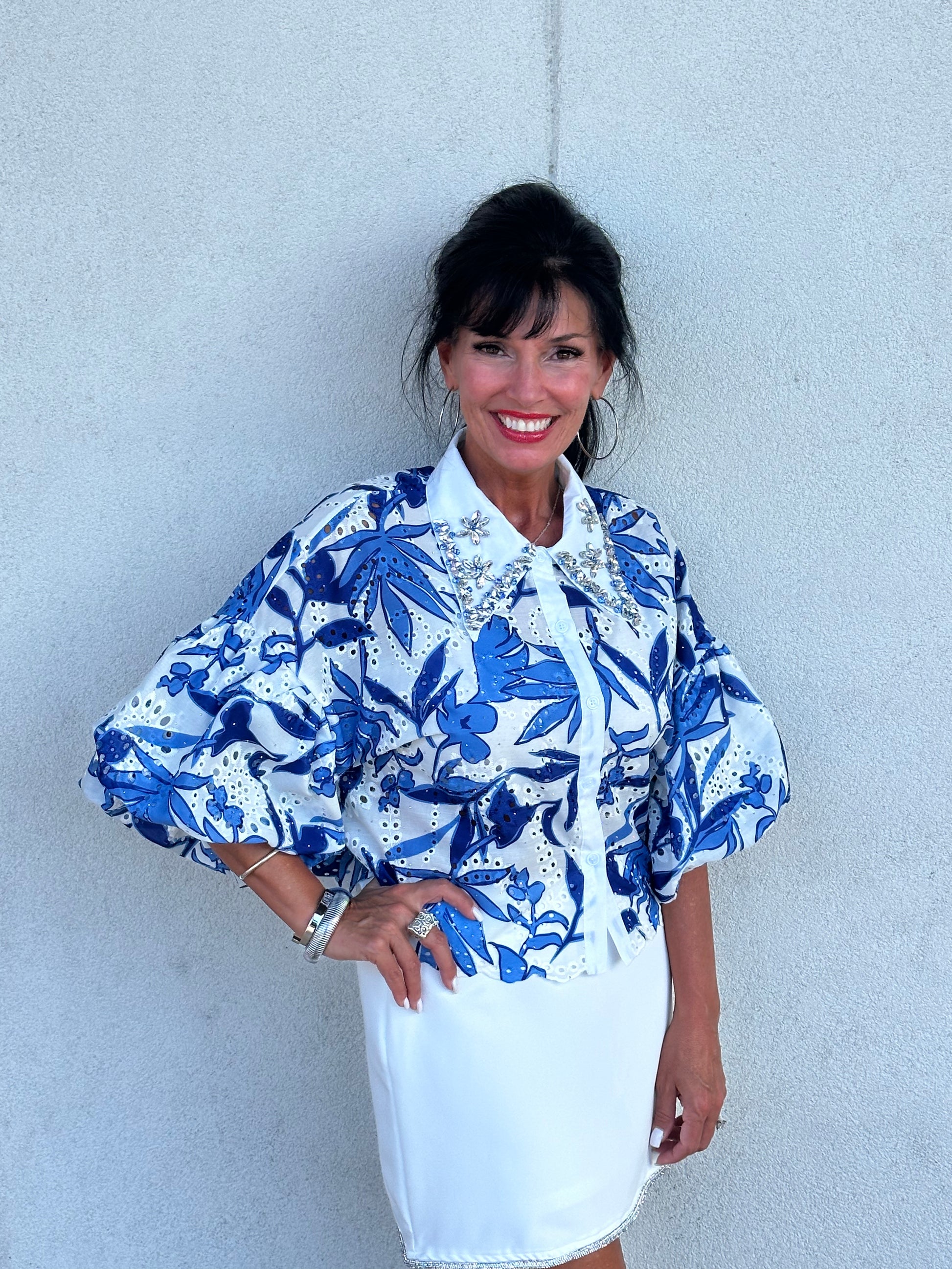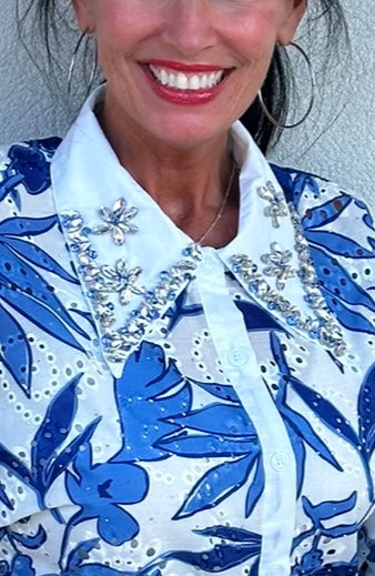 Elevate your style with this stunning statement blouse that blends delicate details with bold charm. Featuring intricate eyelet embroidery, tropical-inspired leaf prints, and a crisp white collar adorned with jeweled floral embellishments, this top is pure wearable art. The voluminous puff sleeves add playful drama, while the tailored front keeps it polished. Whether you choose the soft yellow or breezy blue version, this piece will have all eyes on you.