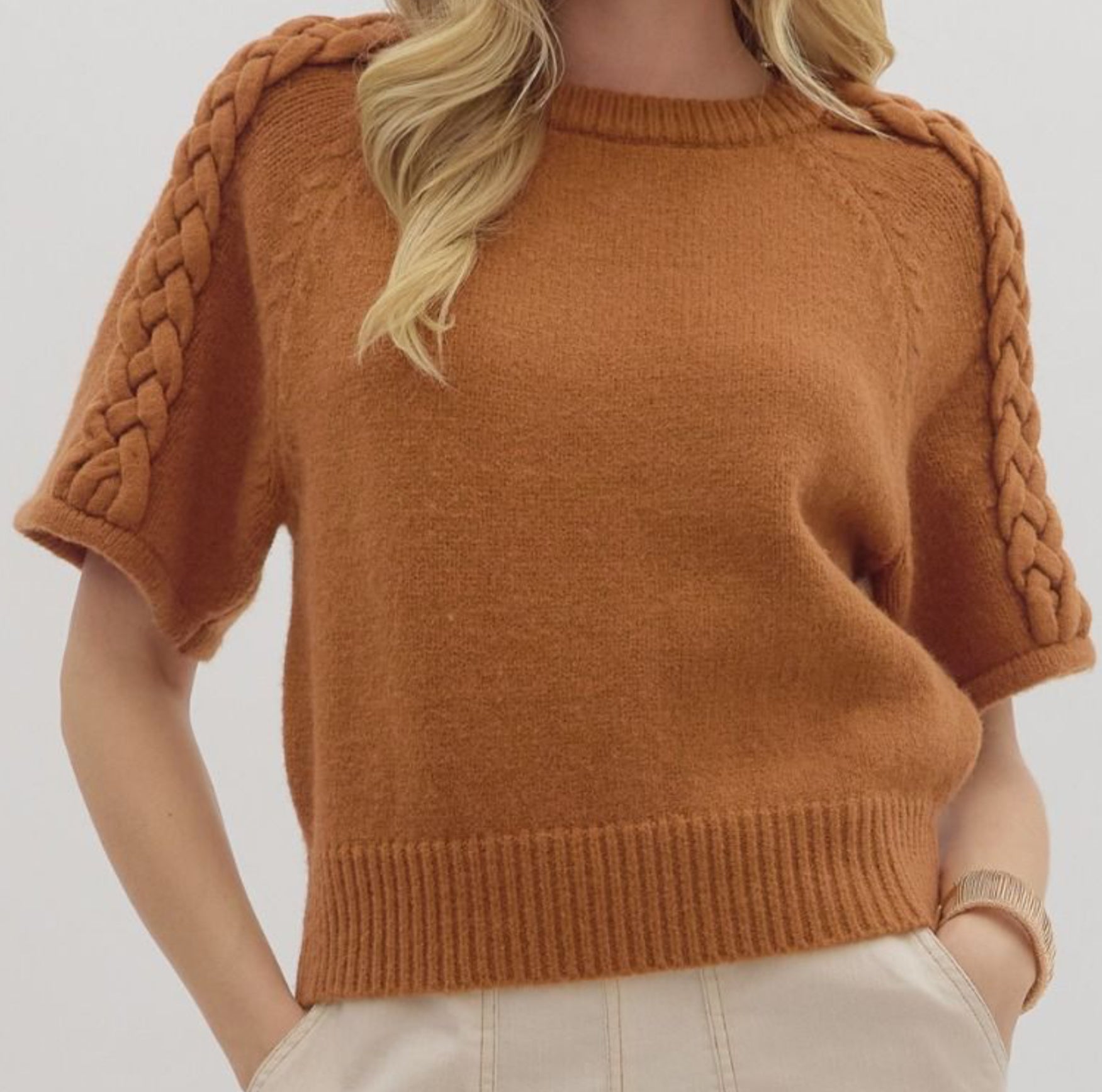 Solid short raglan sleeve sweater top . I love the braided sleeve detail. It has ribbed hem, cuff, and neckline. Unlined. Knit. Non-sheer. Lightweight