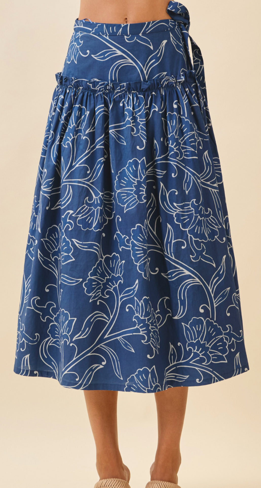 Floral printed wrap midi skirt featuring a flattering A-line silhouette. Designed with a high waist, gathered seams, and an adjustable side tie for a comfortable fit.