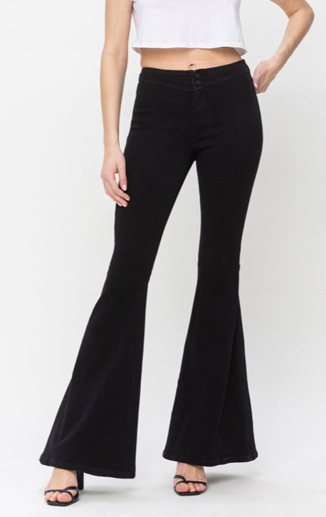 These black flares are a super high rise with straight leg then a flared hem. So stylish and stretchy. No pockets in front just sleek and lean.
