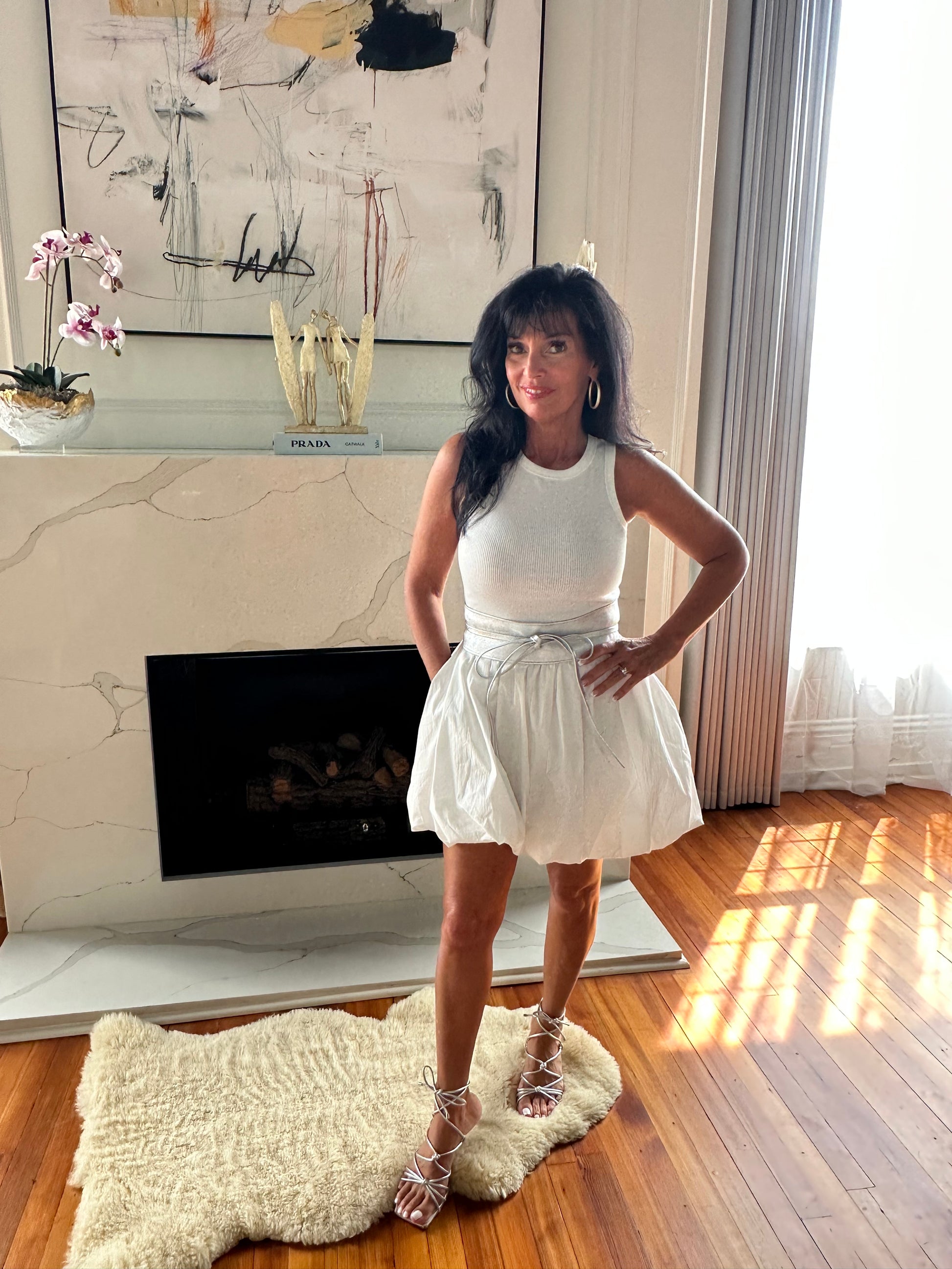 Ribbed knit contrast balloon mini dress in poplin fabric. This sleeveless style features a round neck, ribbed knit bodice, side pockets, and mini skirt with balloon hem.