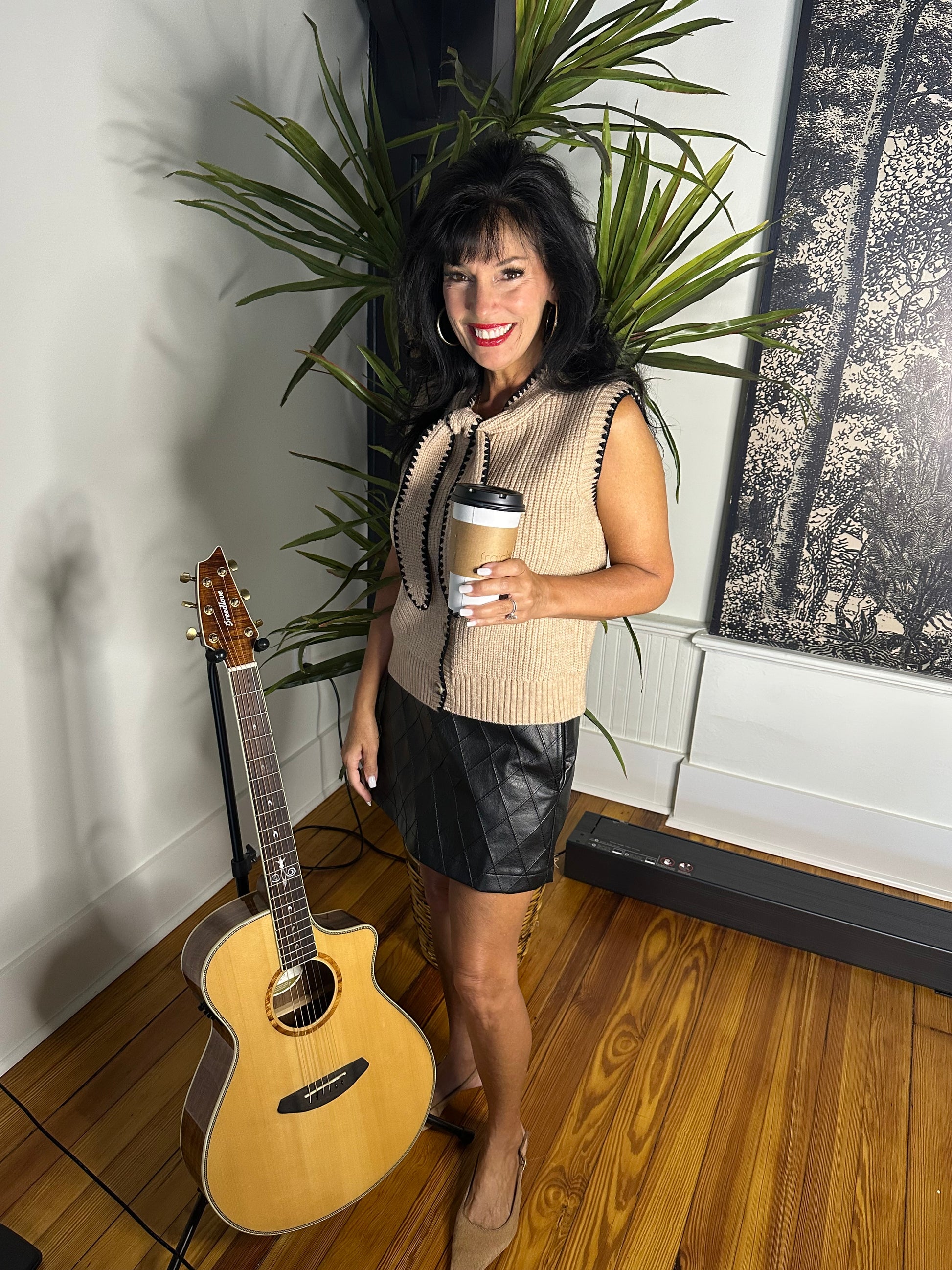 The top is a stylish, sleeveless knit sweater in a soft beige color. It features a ribbed texture, adding depth and interest to the design. The standout element is the unique tie detail at the neckline, which can be styled in various ways for added flair. The edges are trimmed with dark contrasting stitching, providing a chic accent that enhances its overall look. This versatile piece can be layered over shirts or worn alone, making it a great addition to both casual and semi-formal outfits.