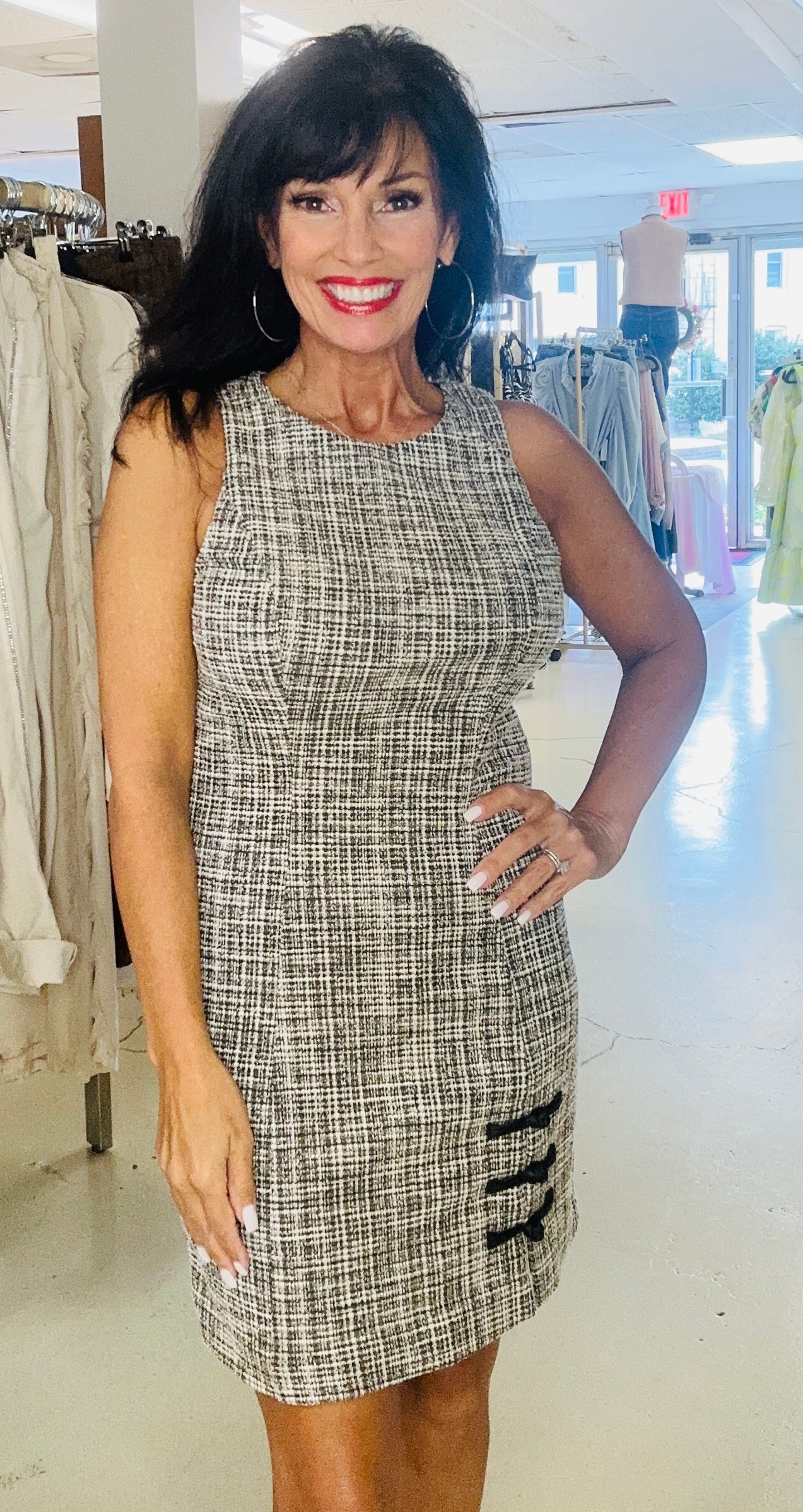The Chic Tweed Shift Dress is a sophisticated blend of classic elegance and modern style. Crafted from a textured tweed fabric in a timeless black and white pattern, this dress features a clean and structured silhouette that flatters a variety of body shapes. The sleeveless design makes it versatile for layering, while the unique button accents on the side add a touch of personality and charm. Perfect for both professional settings and casual outings, this dress can be easily dressed up with heels or kept casual with chic flats. Embrace effortless style with this wardrobe staple that exudes confidence and grace!