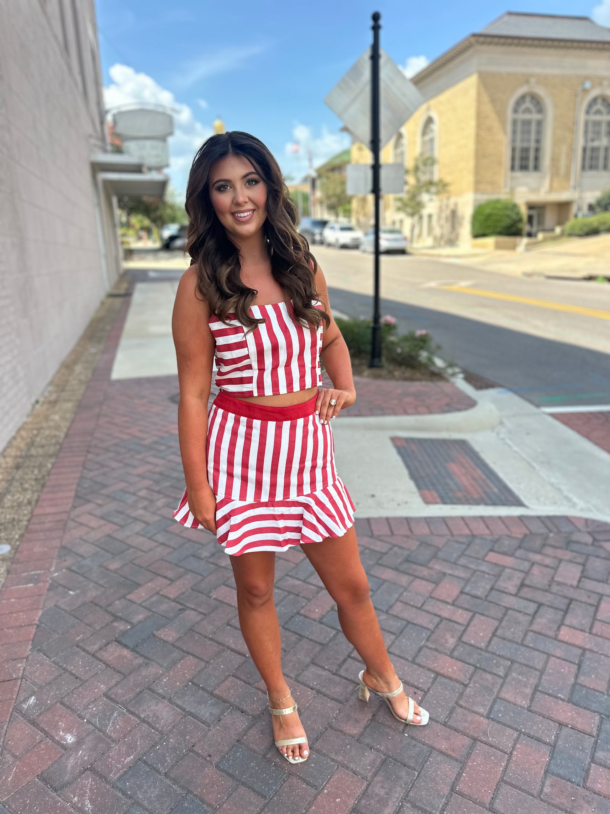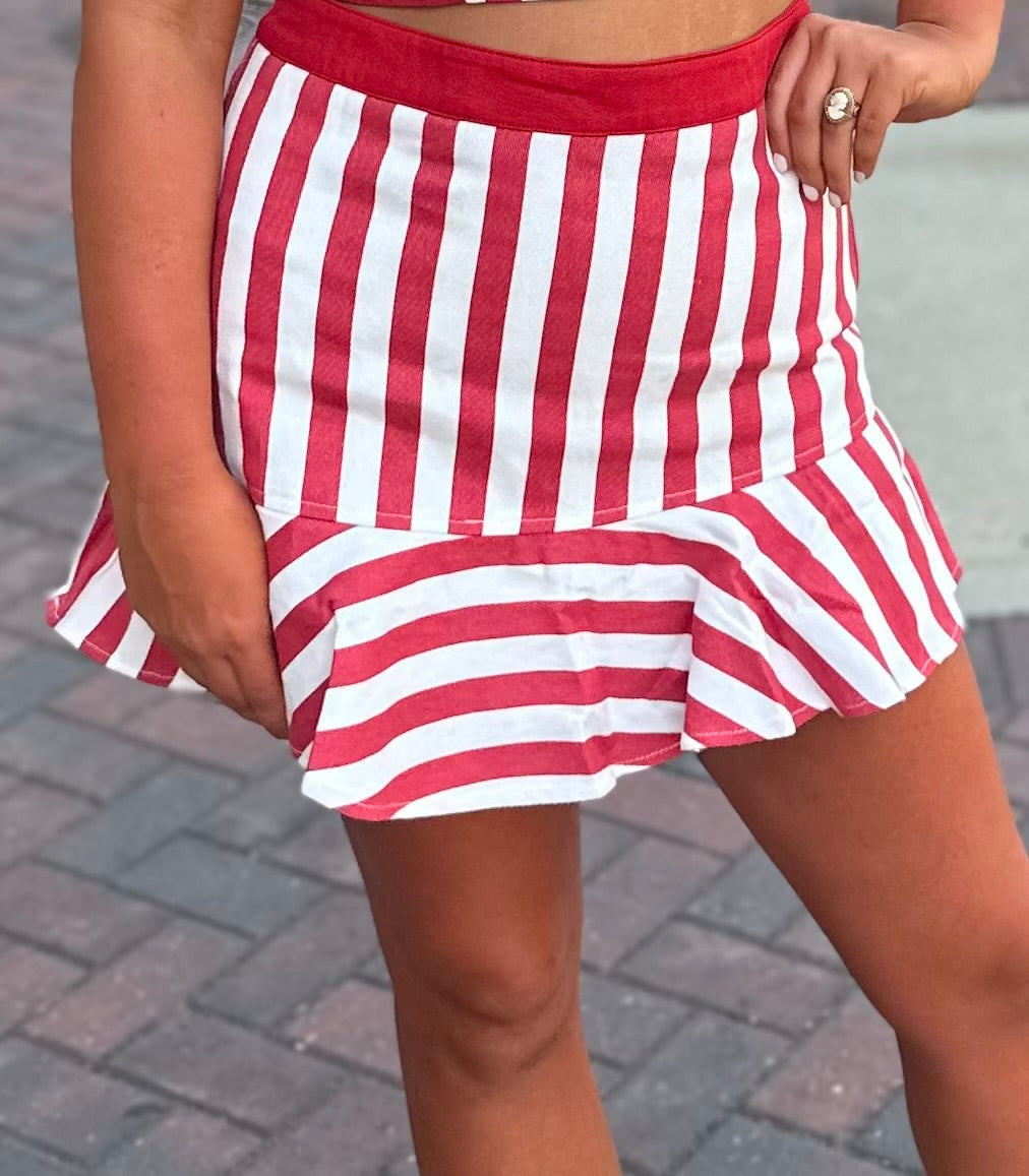 The skirt features a vibrant red and white striped pattern that exudes a playful and summery vibe. It has a fitted waistband that transitions into a flared hem, creating a flattering silhouette that moves beautifully. The ruffled edge adds a feminine touch, making it perfect for casual outings or beach days.