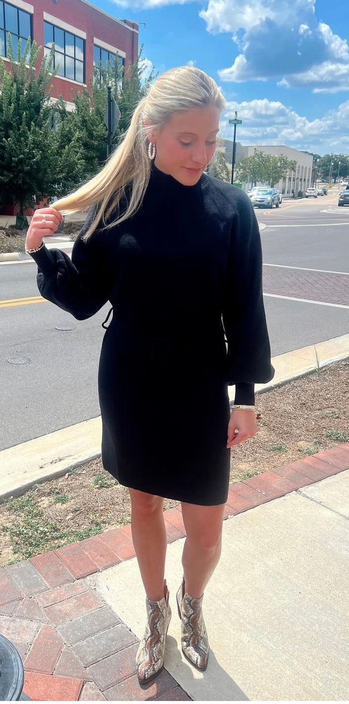 These dresses are the perfect sweater material. They are not clingy. The sleeves are a slight balloon sleeve and also come with a belt.