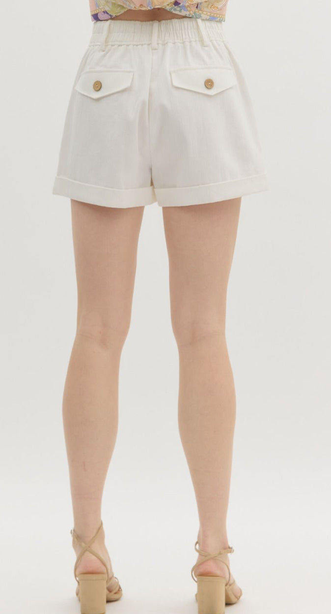 Solid high waist pleated rolled cuff hem pintuck shorts. Button fly-front zipper closure. Pockets at sides. Unlined. Woven. Non-sheer. Lightweight.