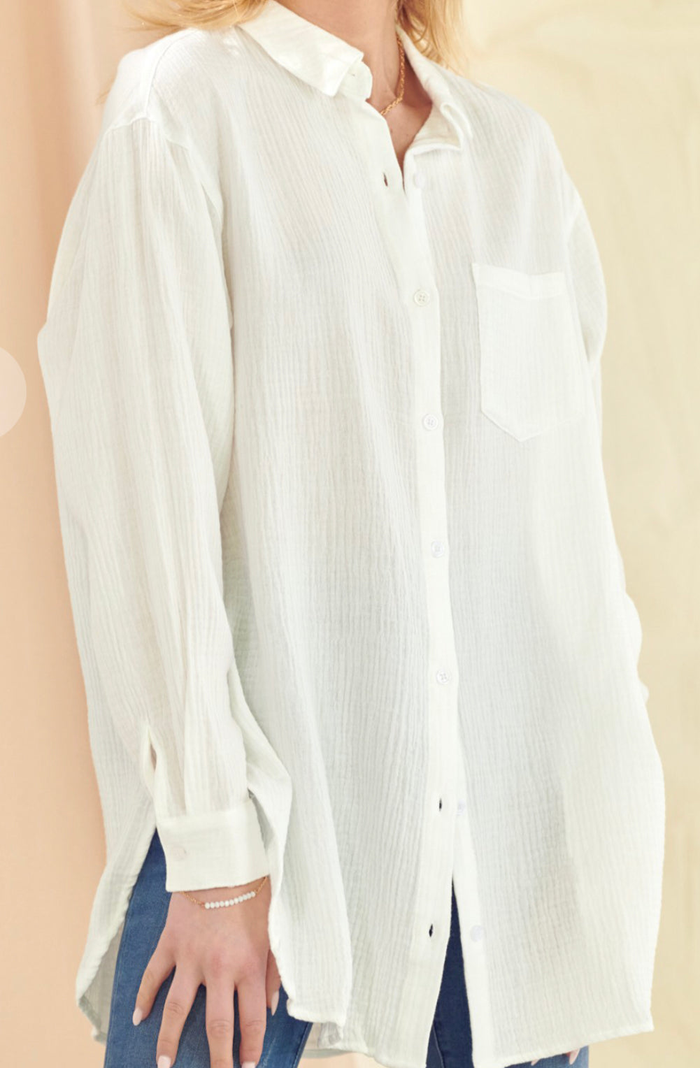 This cute Crinkle woven top is so cozy and oversized. It has long sleeves and buttons up front.