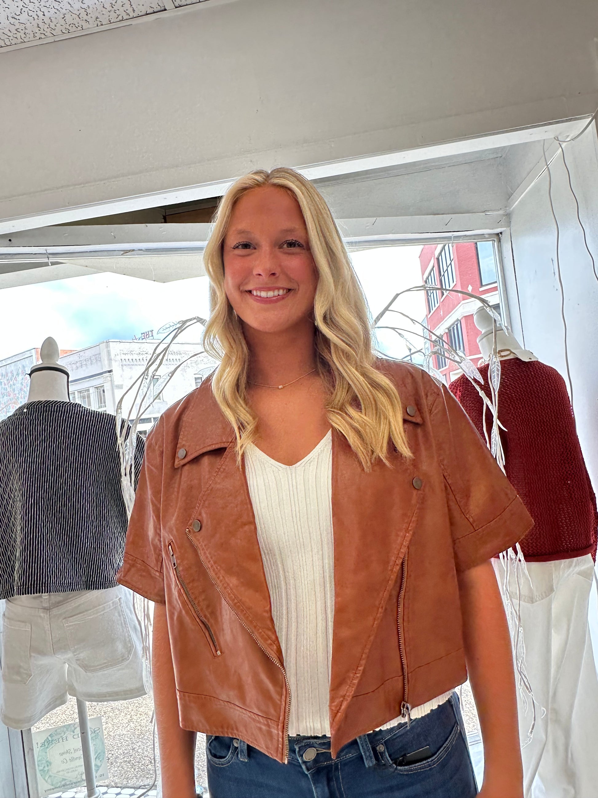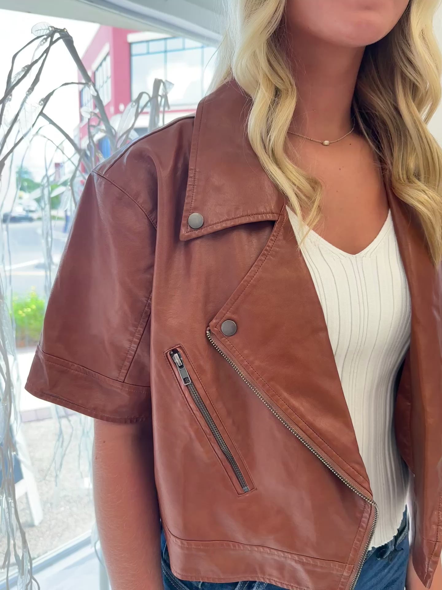 This faux leather jacket exudes a chic and edgy vibe. Its rich, warm brown color adds a touch of sophistication, while the cropped design gives it a modern twist. Features include a classic asymmetrical front zip, side zip pockets, and bold lapels, combining style with practicality. The slightly structured silhouette enhances its fashionable appeal, making it a versatile addition to any wardrobe.