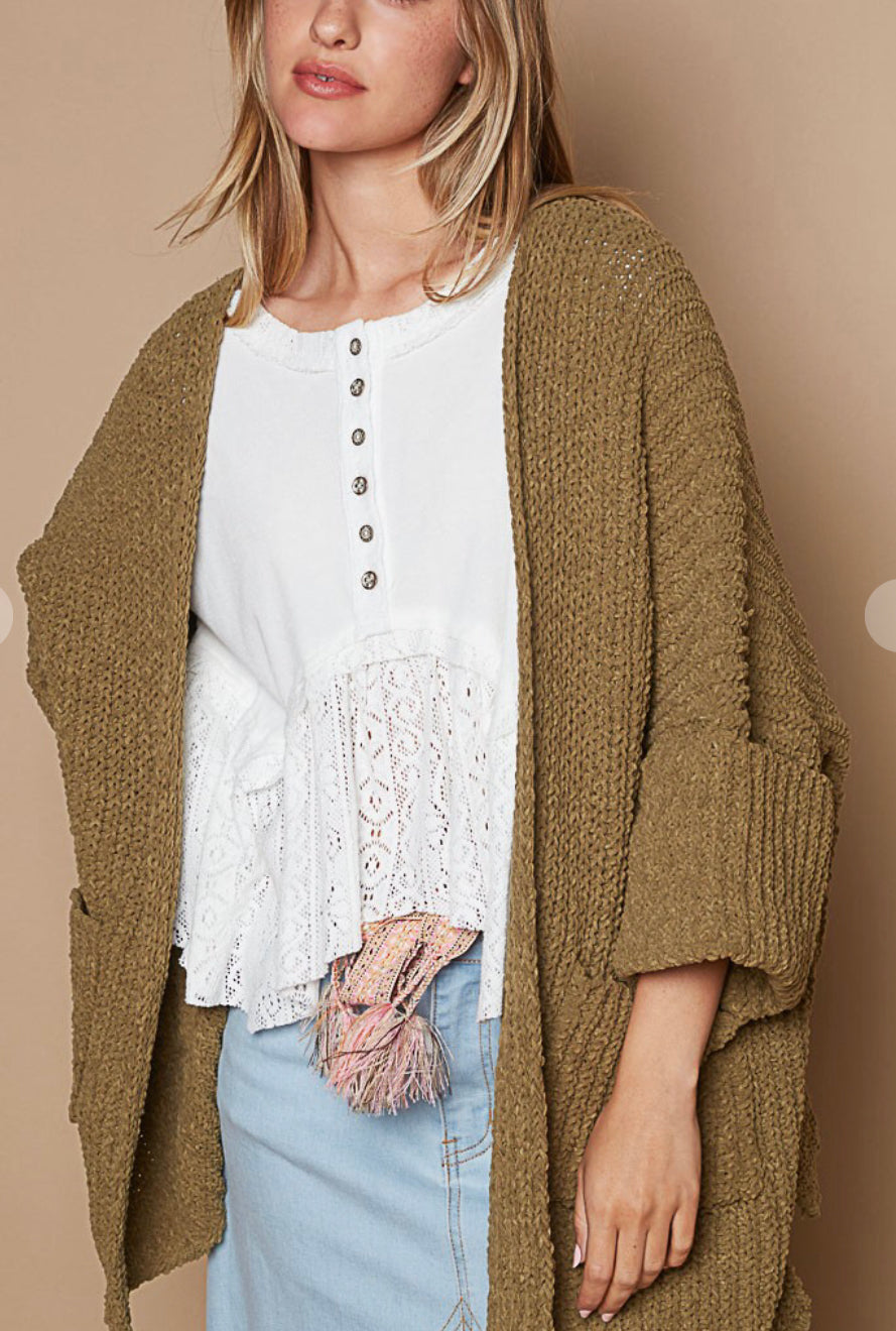 Edge-to-edge long sleeve with pockets roomy fit cardigan. Comes in Olive Green & Taupe Specs/Dimensions: - Total LENGTH from HPS: 25-1/2" - CHEST: 29-1/2"