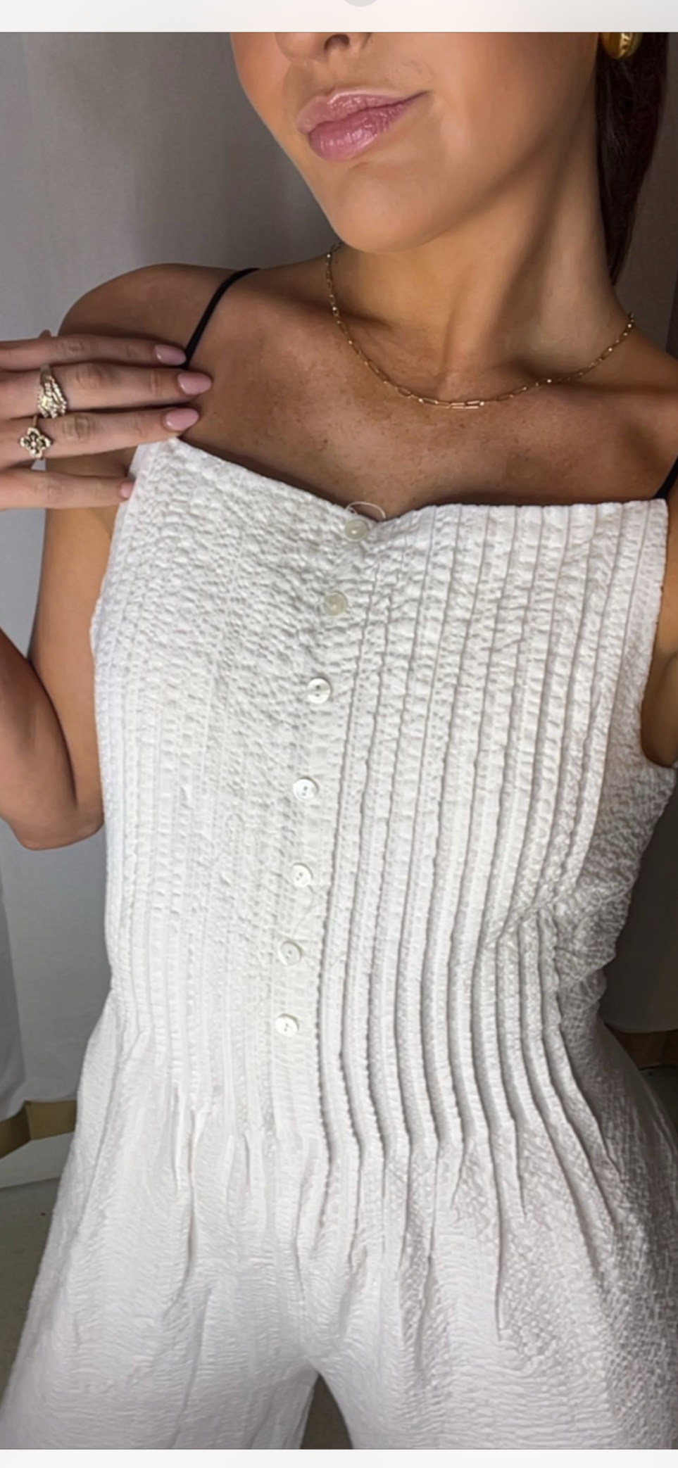 Crinkled Fabric Jumpsuit With Contrast Strap. So very cute with pleated detail in front and a black tie in back.