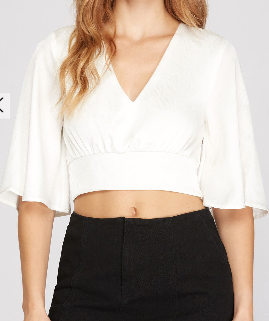 BELL SLEEVE V NECK TEXTURED SATIN TOP WITH WAIST BAND. So cute and fun in these beautiful colors.