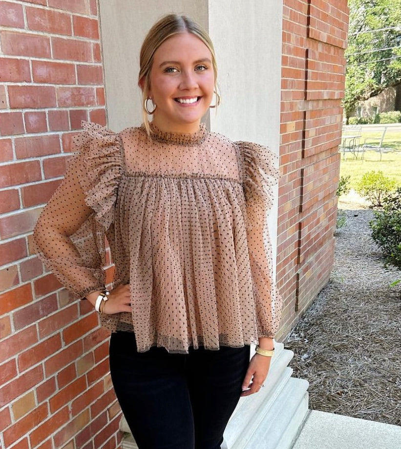 Dotted swiss long sleeve blouse featuring ruffle detail at shoulders and neckline. Button closure at back. Lined. Woven. Semi-sheer. Lightweight.