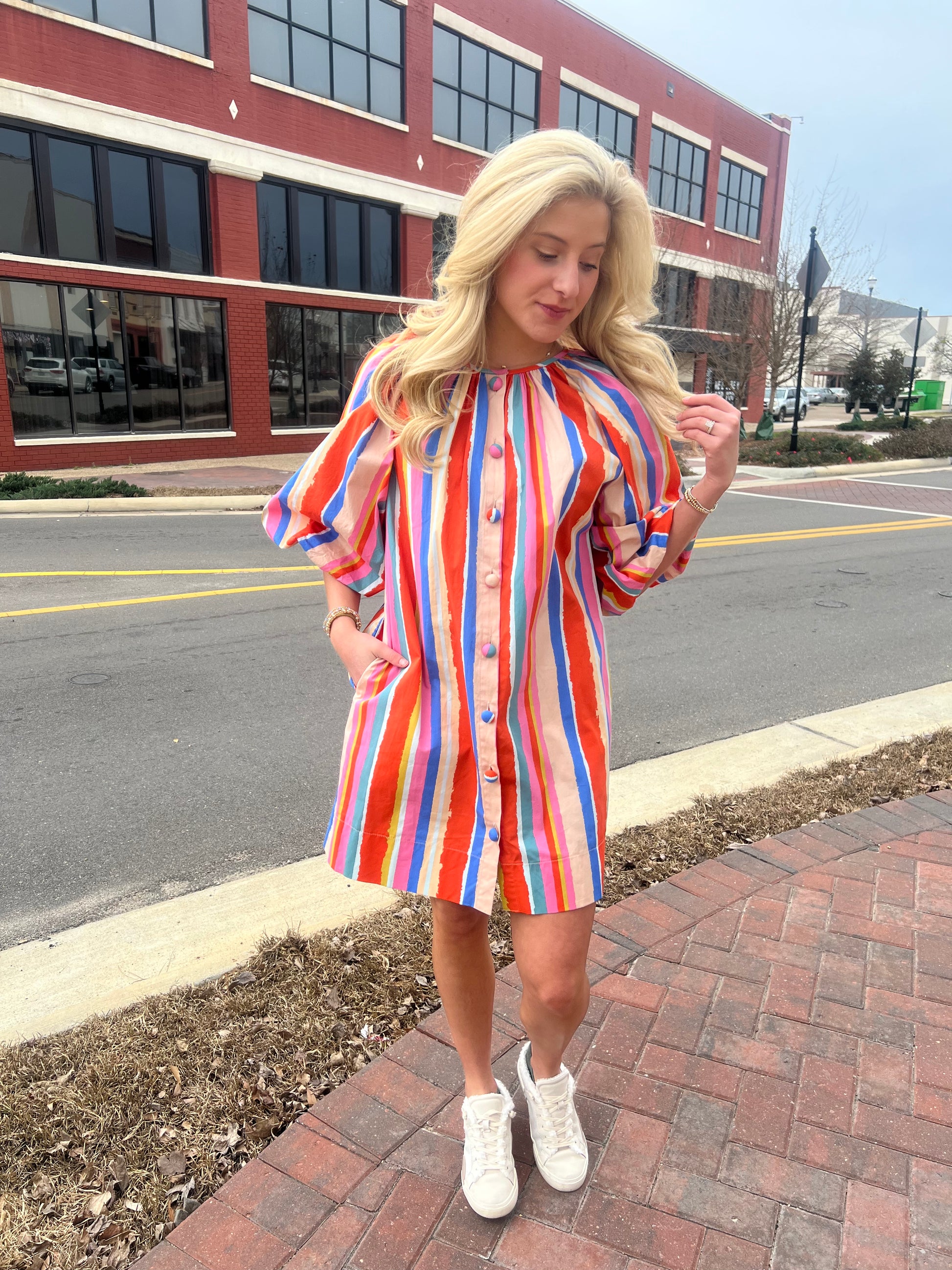 This is a beautiful striped dress with bright and vibrant colors. It buttons up the front with covered buttons. the puff sleeves set it off.