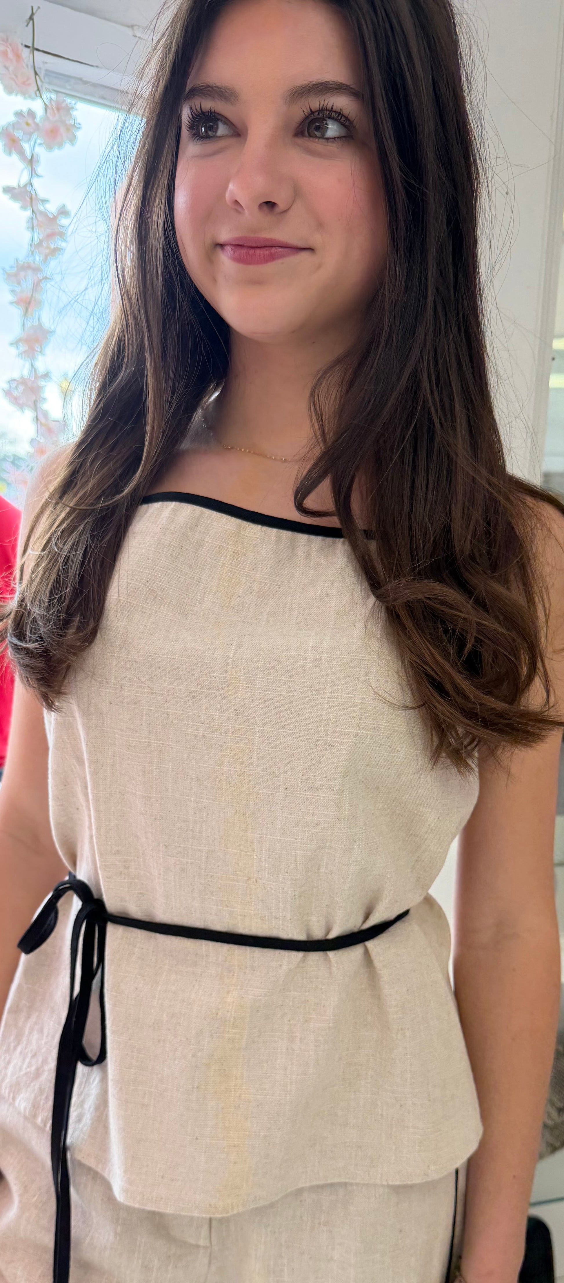 This stylish linen-blend top is the perfect mix of effortless and elevated. Designed with a sleek square neckline and delicate shoulder straps, it features a flattering tie-back detail that cinches the waist for a customizable fit. The neutral woven texture gives it a soft, natural look that pairs beautifully with denim, trousers, or skirts.