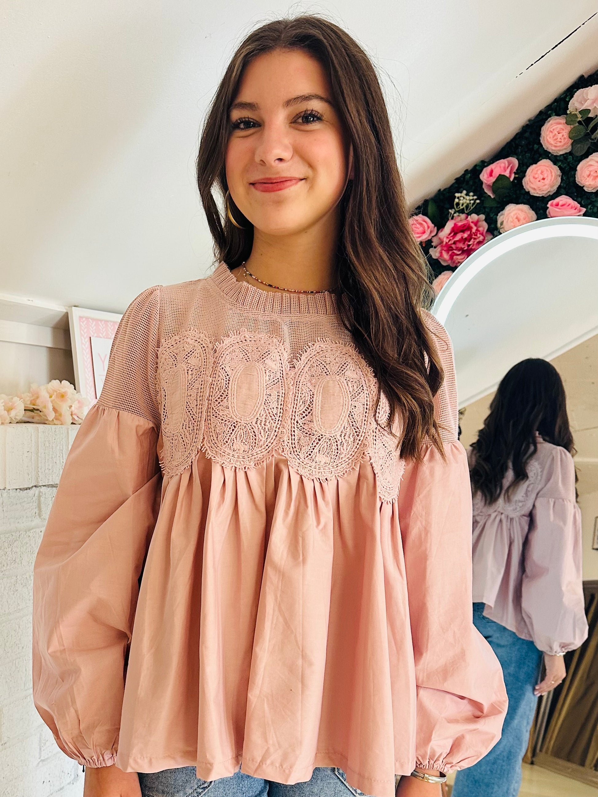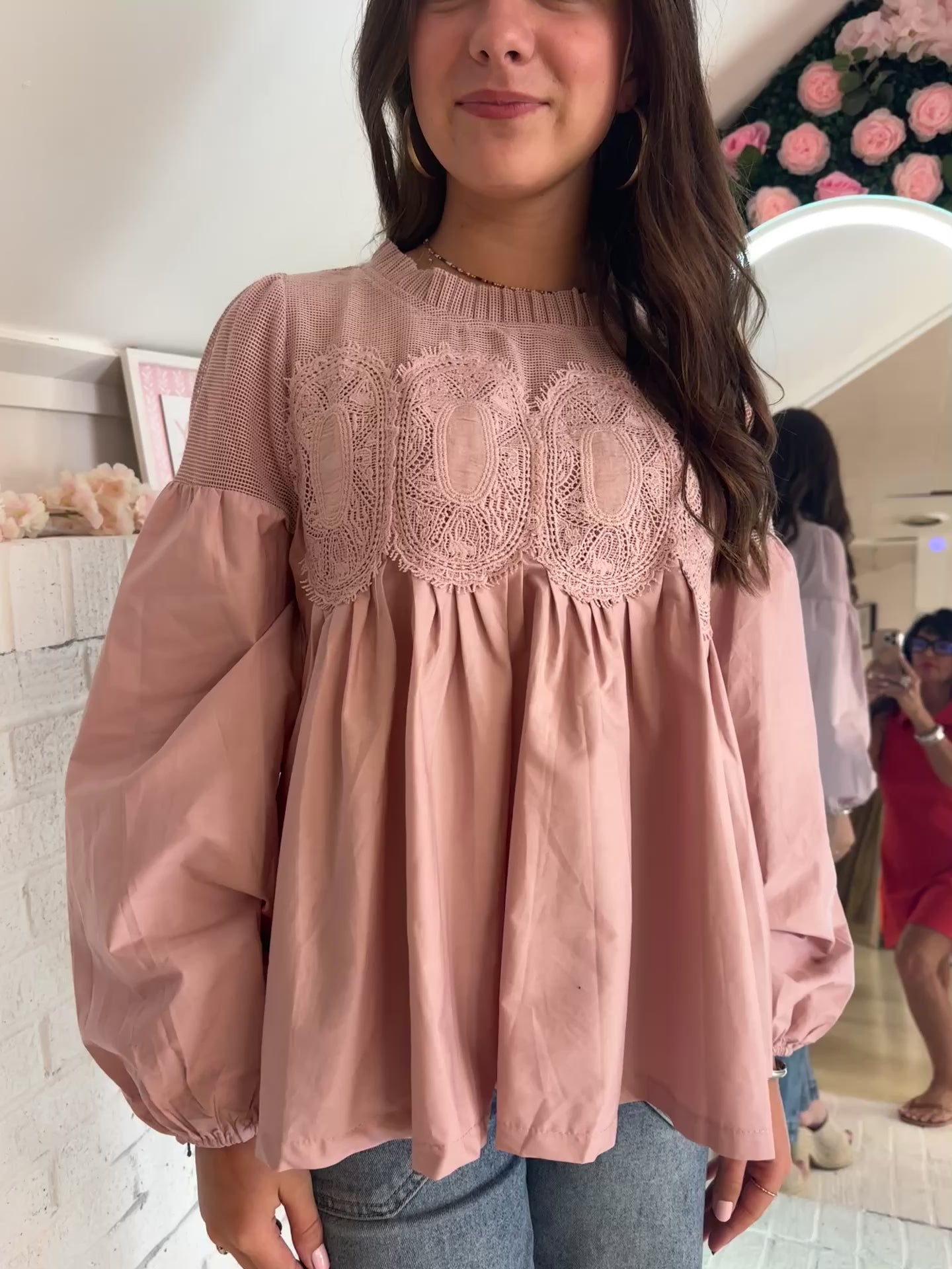 This top features a delicate design with a combination of soft fabric and intricate lace detailing. The bodice showcases a beautiful lace panel with ornate patterns, adding elegance to the overall look. The long sleeves are slightly puffed, giving it a romantic and airy feel, while the pleated bottom adds movement and a beautiful silhouette.