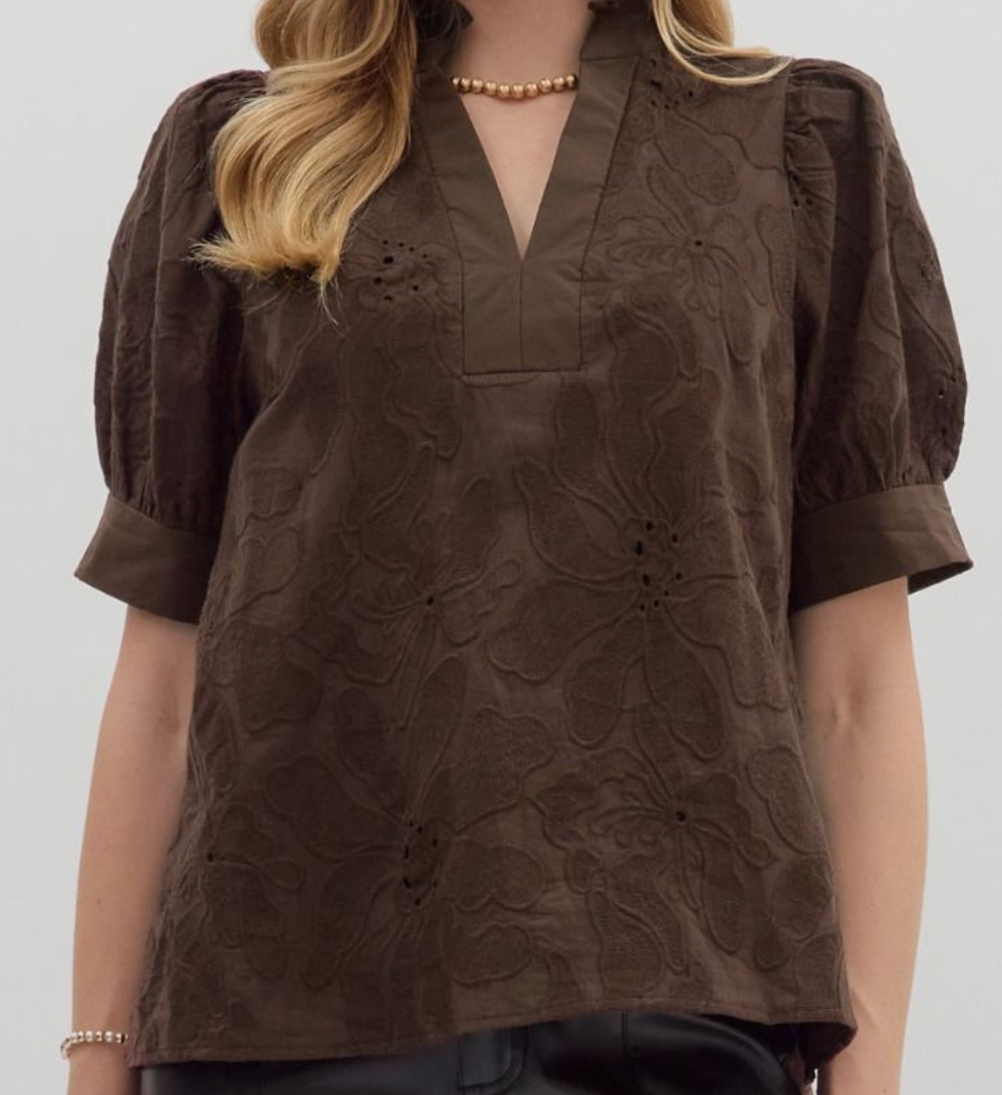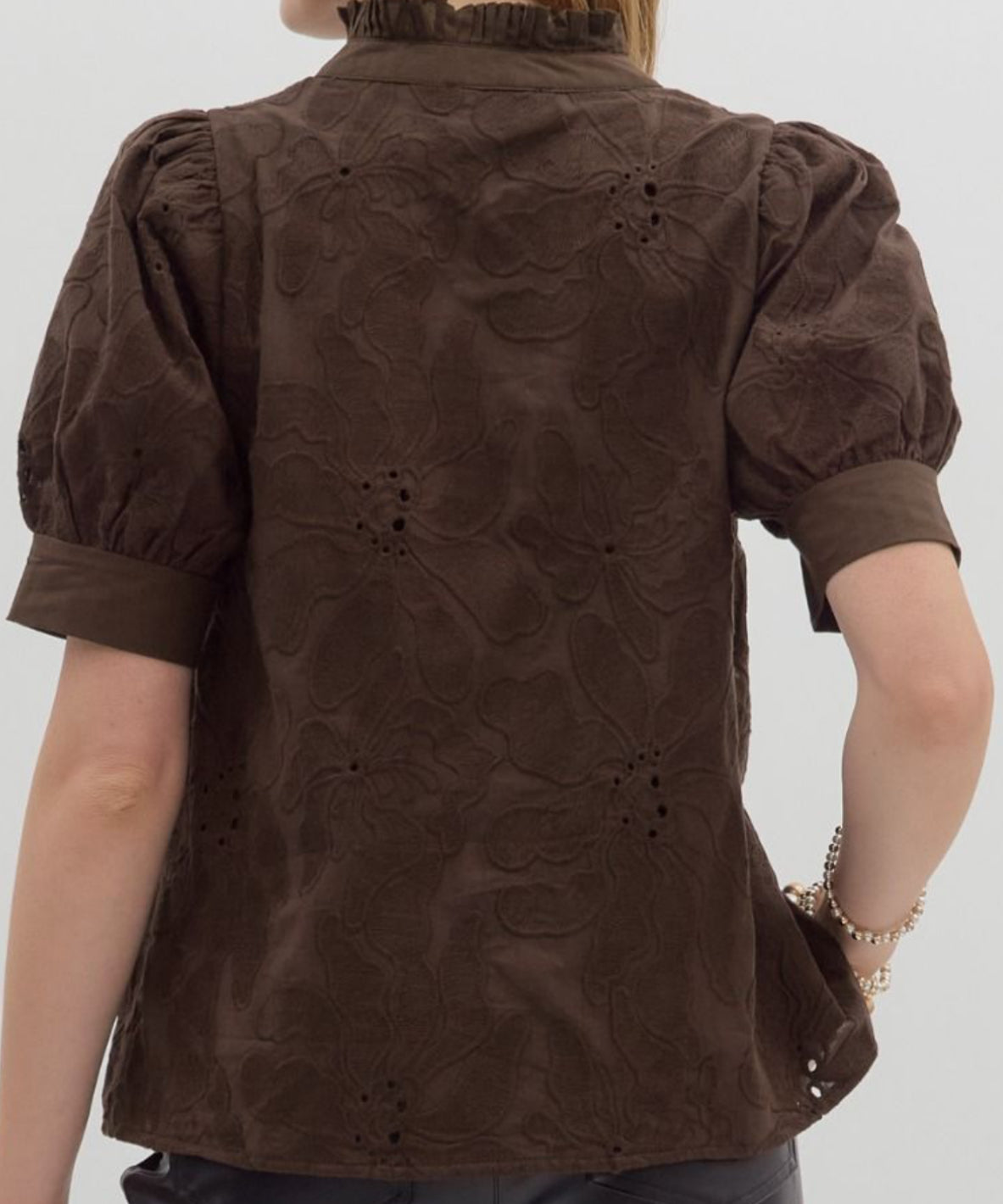 Floral embroidered short puff sleeve pullover top featuring pleated band collar split V-neck. Lined. Woven. Non-sheer. Lightweight.
