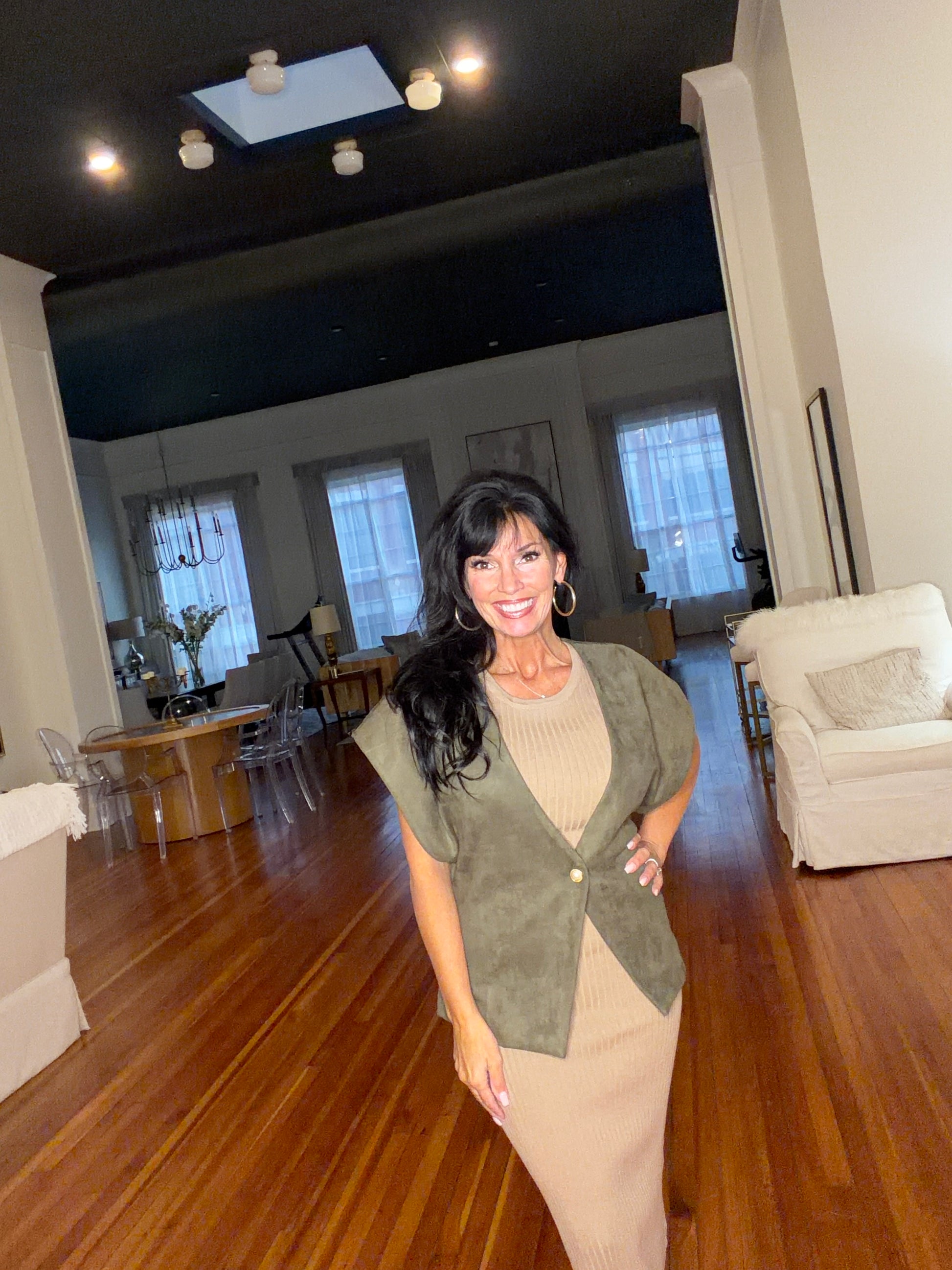 Elevate your layering game with the Extra Olive Vest, crafted in a soft suede-like fabric for a touch of understated luxury. Featuring a modern boxy silhouette, cap sleeves, and a deep V-neckline with a single button closure, this versatile piece adds effortless polish to any look. Perfect for pairing over a fitted top, flowy blouse, or even a sleek dress, it’s the statement vest that transitions seamlessly from day to night.