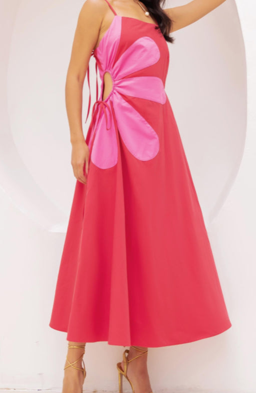 Sleeveless side cutout flower detail long dress in cotton poplin fabric. This sundress style features a side cut out detail with adjustable tie, square neckline, adjustable straps, side pockets, a feminine patchwork flower detail and lining.