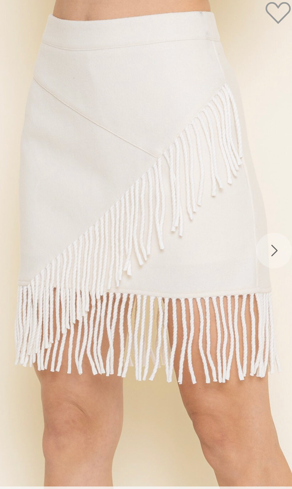 This mini skirt is a great look with the overlap fringe look. Has a side zipper.