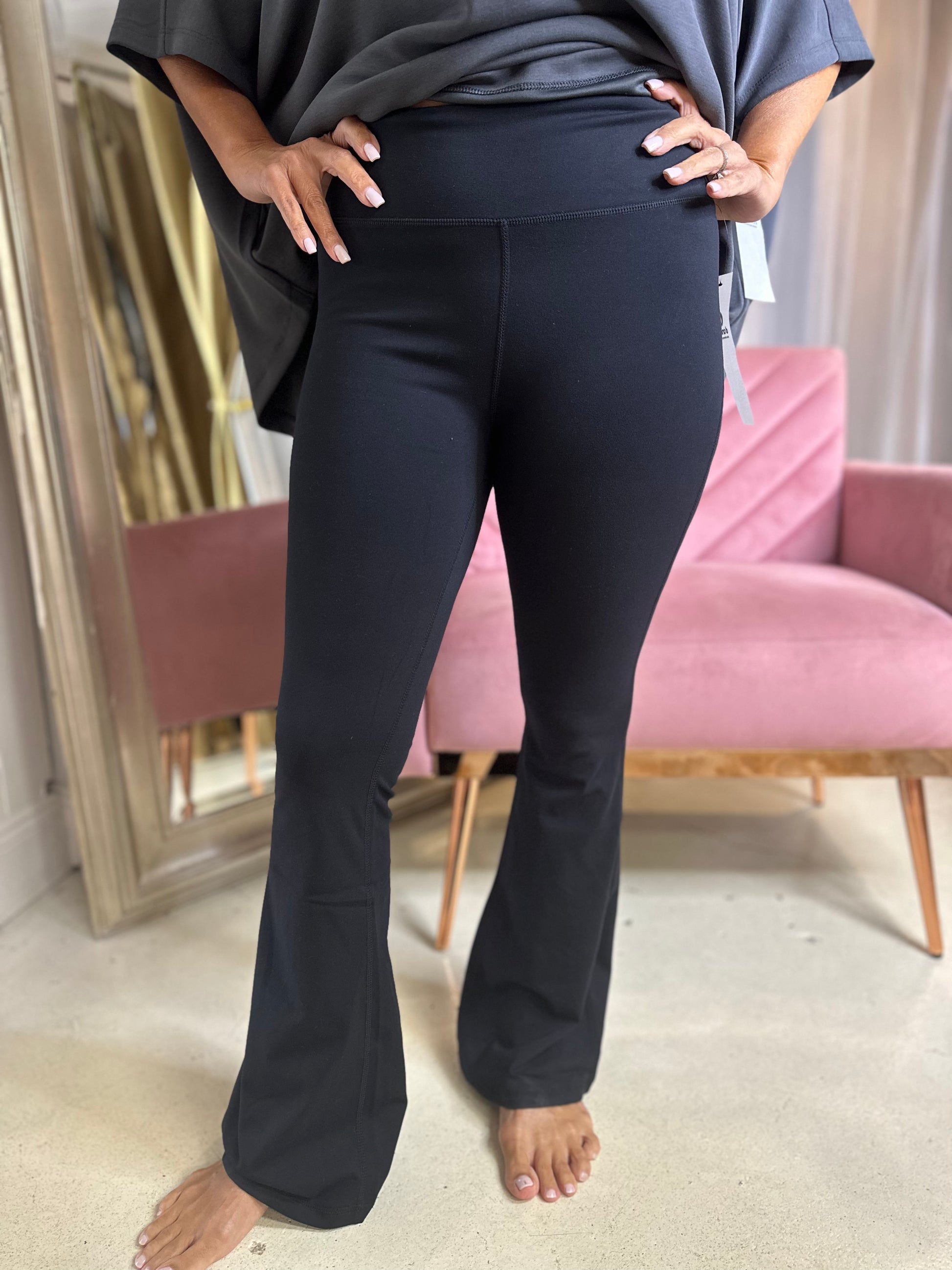 These are a wonderfully comfortable legging with 76% Polyester 24% spandex blend. They are a high waist with a flare leg.