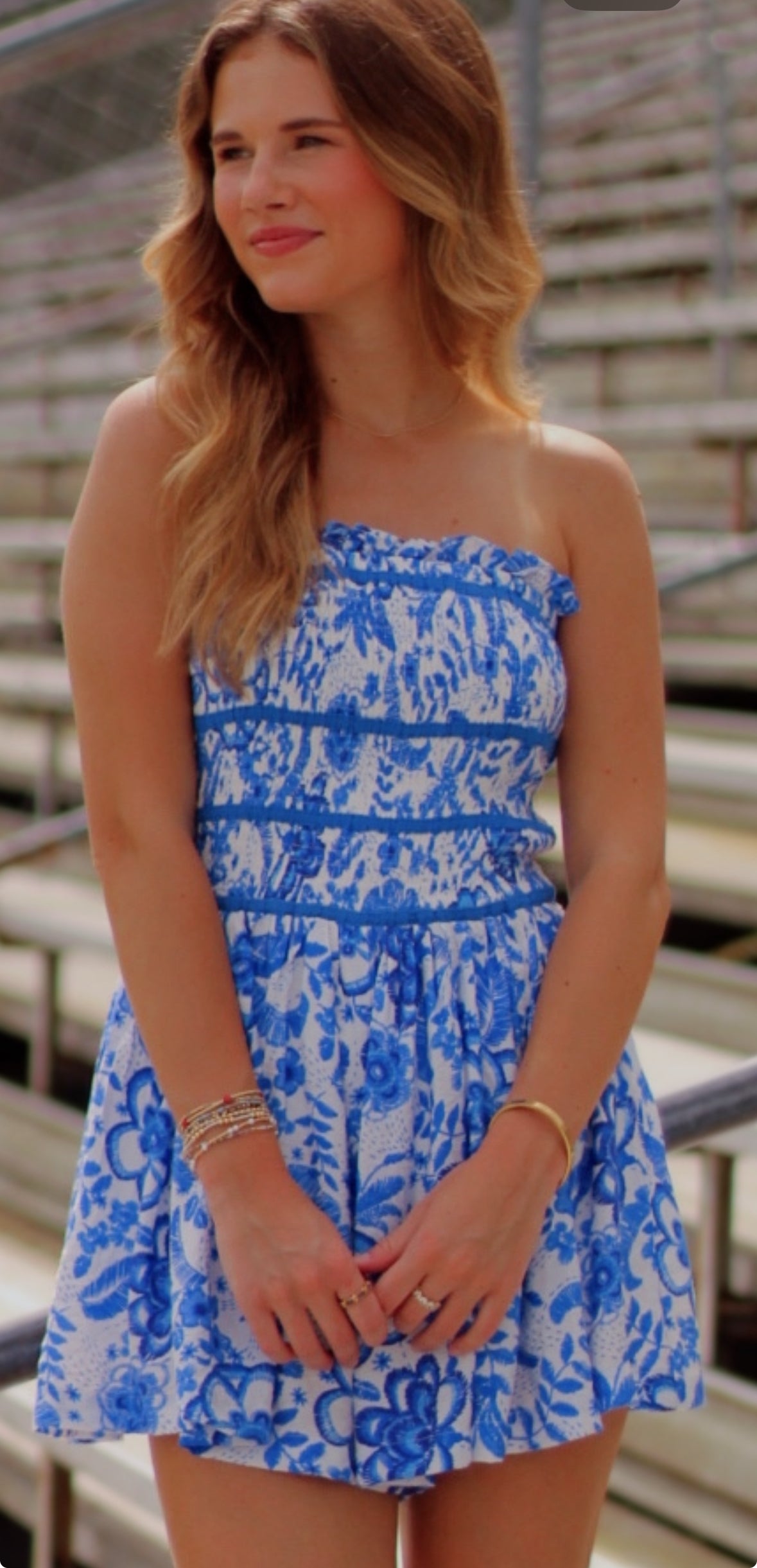 The romper features a vibrant blue and white floral pattern that adds a fresh, summery vibe. It has a fitted, smocked bodice with ruffled accents along the top, providing a playful and feminine touch. The spaghetti straps keep it lightweight and breezy, while the flared shorts allow for comfortable movement.
