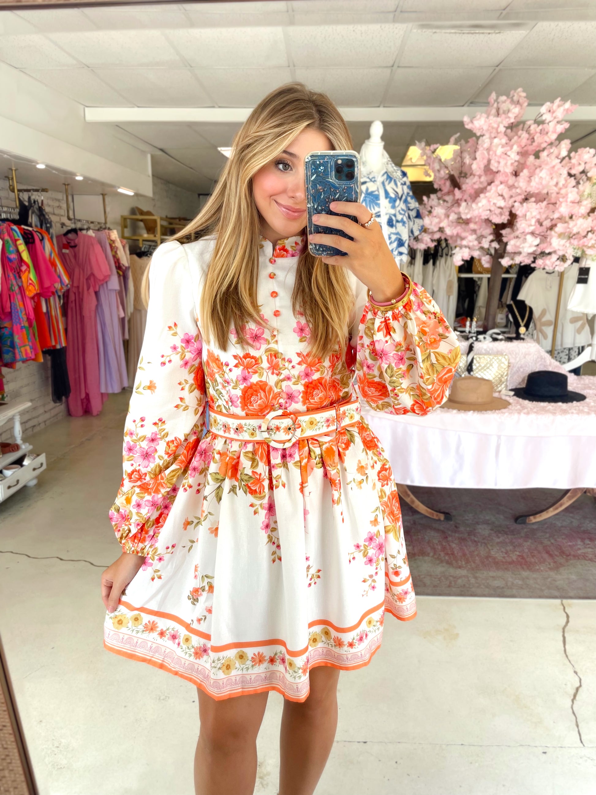 The dress is a charming, floral-printed piece featuring a white background adorned with vibrant pink and orange blooms. It has a high neckline and elegant long sleeves that are slightly puffed, adding a romantic touch. The front is embellished with decorative buttons, enhancing its vintage appeal. A matching belt cinches the waist, accentuating the silhouette and adding a polished finish. This delightful dress is perfect for spring and summer occasions, combining femininity and style effortlessly.