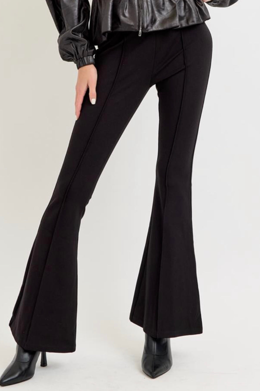 PONTE WAIST ELASTIC FLARE PANTS. They have a front seem and are a stretch fabric with a vey tailored look.