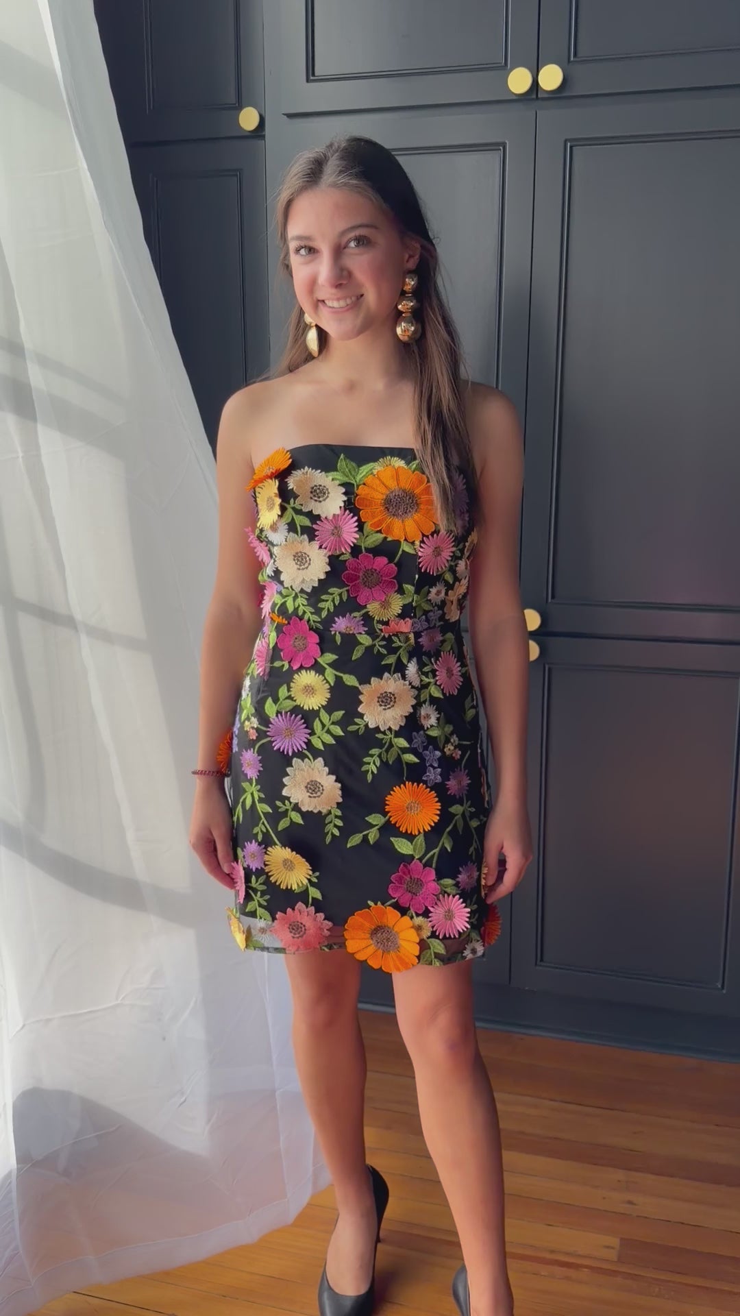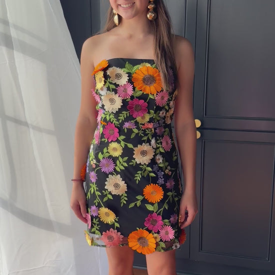 Make a statement in our Garden Gala Dress! This stunning piece blooms with vibrant 3D floral embroidery in shades of orange, lilac, cream, and fuchsia against a sleek black backdrop. The fitted silhouette and delicate details create a show-stopping look that’s equal parts romantic and modern.