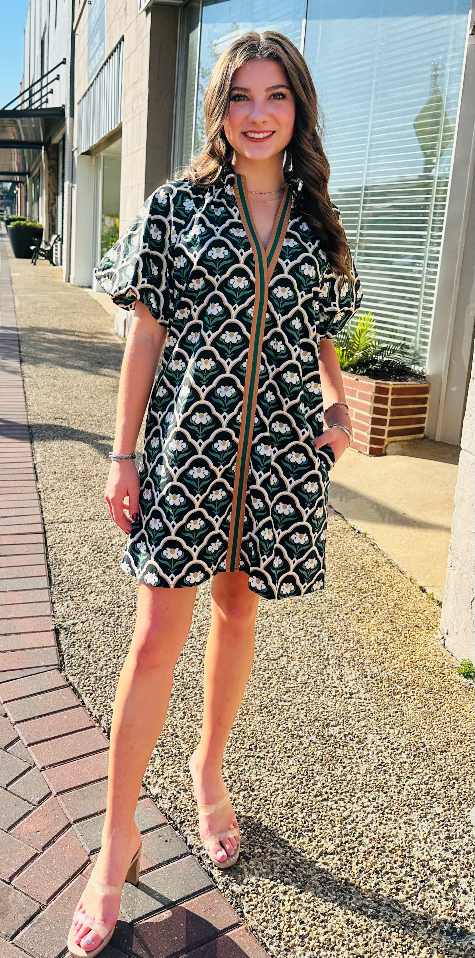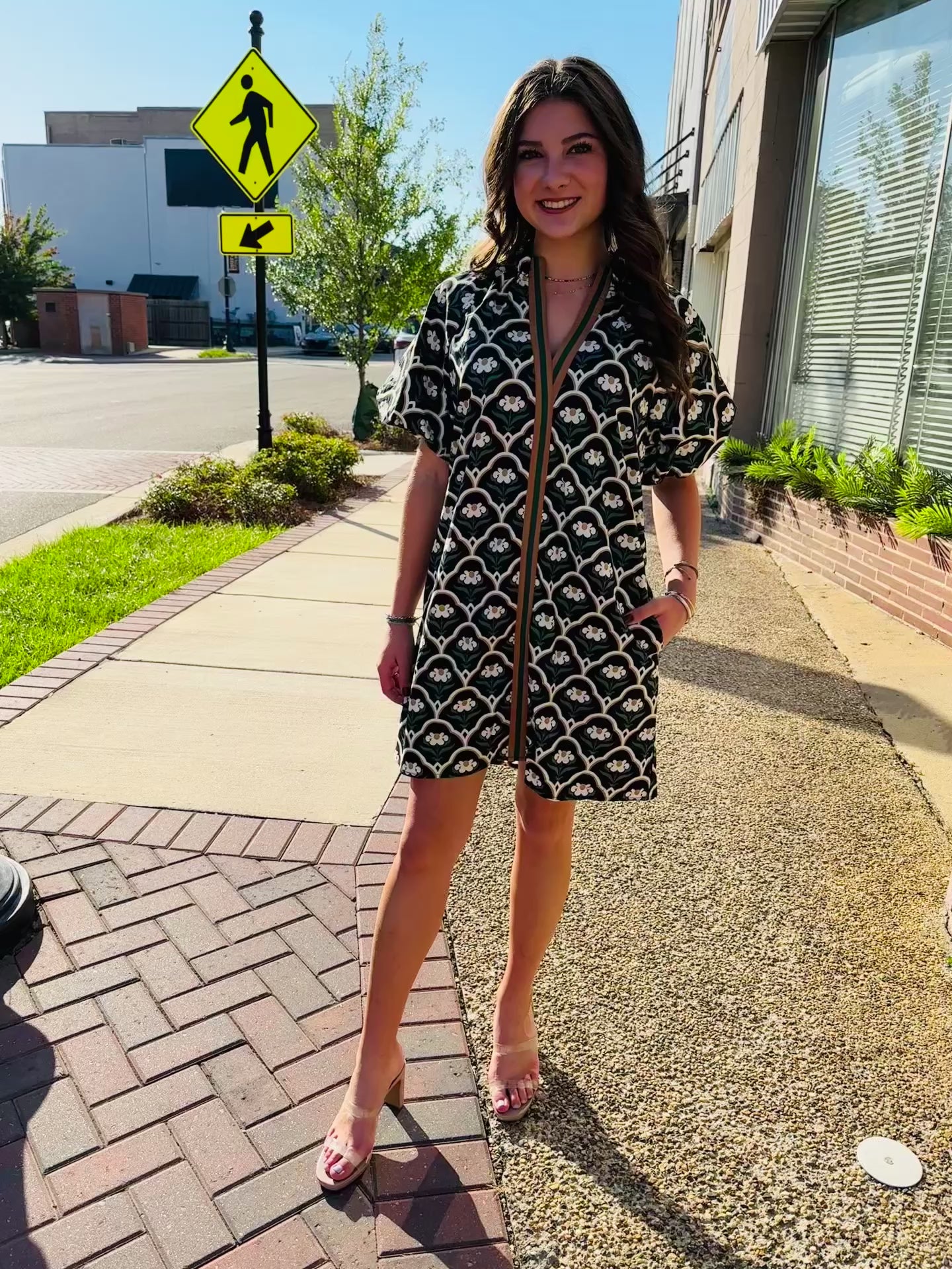 Embrace effortless elegance with the Garden Melody Dress. Featuring a rich green base adorned with intricate floral patterns, this dress exudes a sense of nature's beauty. The playful puff sleeves and relaxed silhouette offer both comfort and style, making it perfect for casual outings or summer gatherings. A distinctive golden-brown accent runs down the front, adding a touch of sophistication. Pair it with sandals for a laid-back look or dress it up with heels for a special occasion. Perfect for those who love to blend comfort with chic fashion!