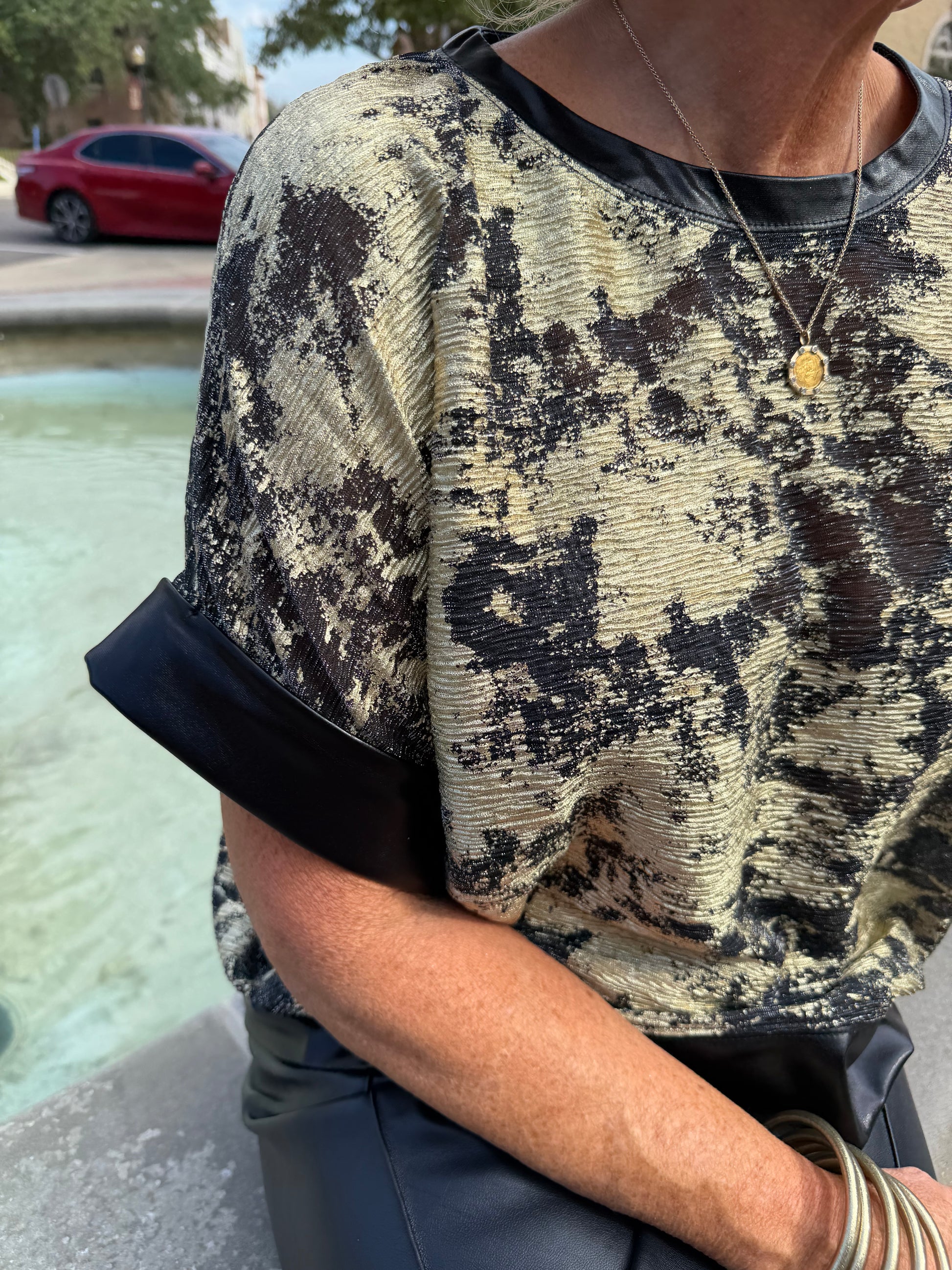 Make a fierce statement in our Glitz & Glam Luxe Top! This metallic gold and black abstract design shimmers with attitude, trimmed in sleek faux leather for an edgy, high-end touch. The relaxed silhouette drapes beautifully for a look that’s both effortless and glamorous.