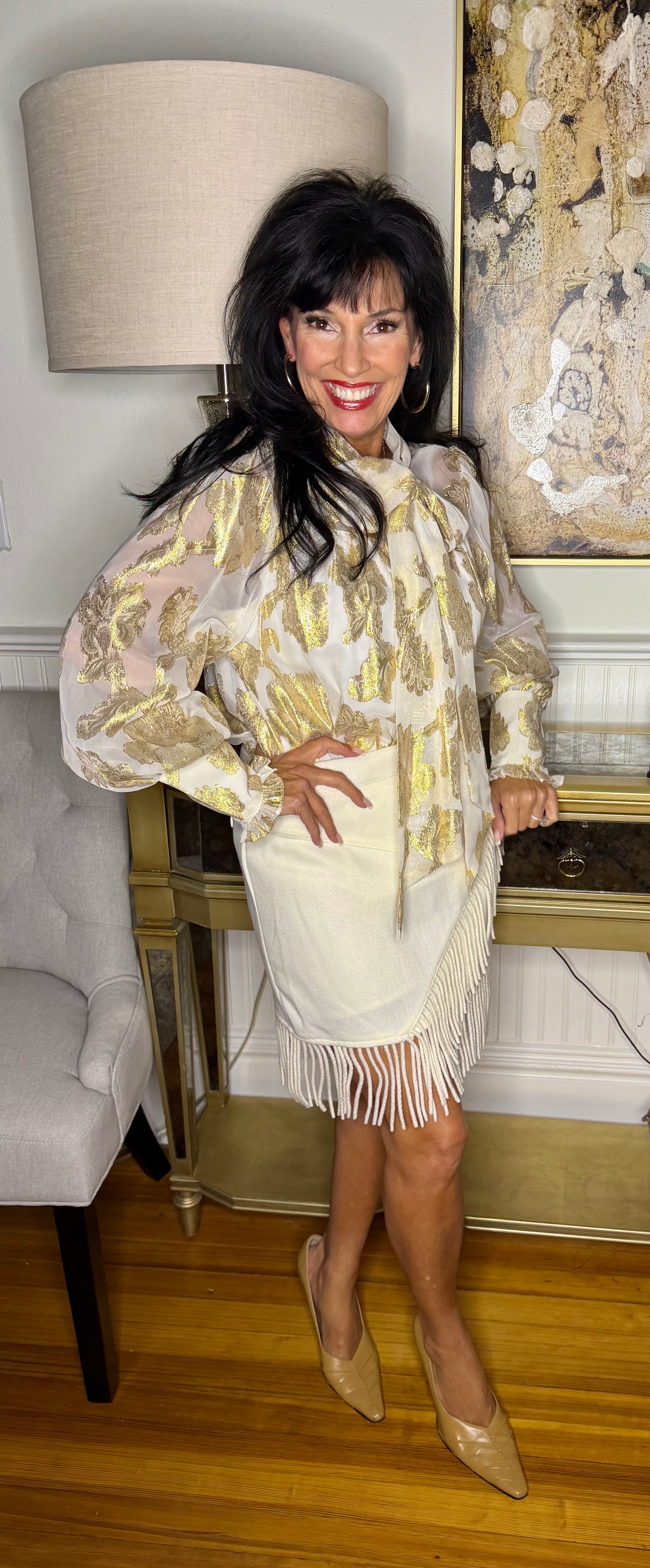 This stunning piece features a sheer cream base with shimmering metallic gold floral embroidery that catches the light from every angle. The statement bow tie neckline adds a touch of timeless sophistication, while the billowy sleeves and smocked cuffs bring a soft, romantic finish. Perfect for holiday parties, special dinners, or any time you want to shine with effortless grace — this blouse is pure elegance wrapped in shimmer.