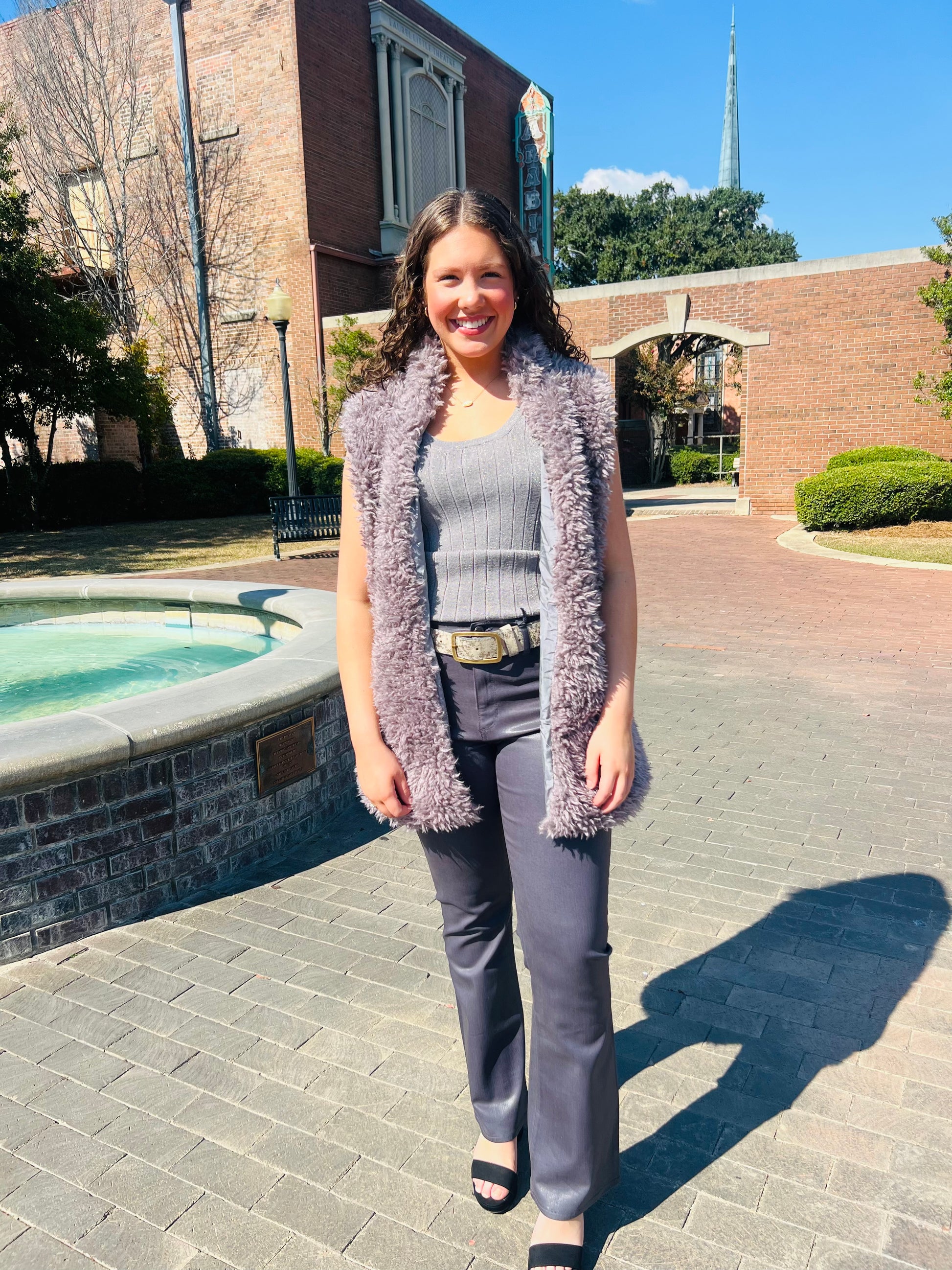 This is a cute sheeplike fur vest. It’s sleeveless and has hidden closure in the front.