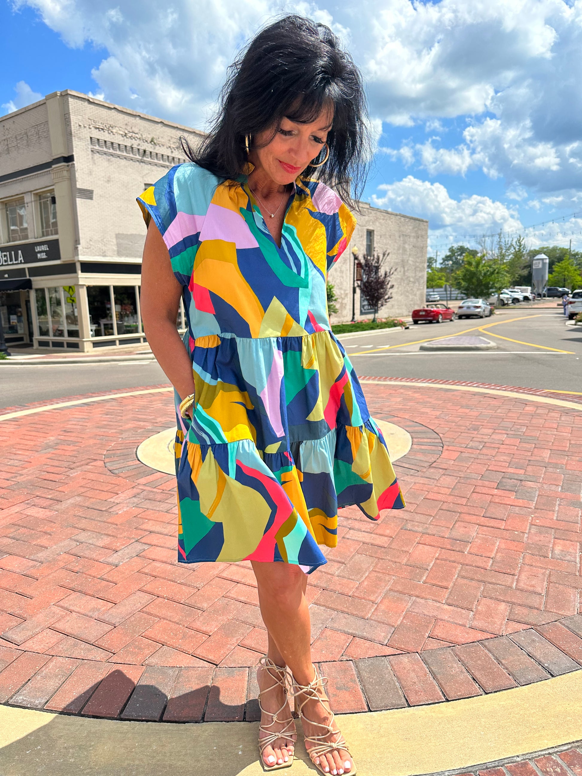 Feel the vibes of this vibrant Gia Abstract Janelly Poplin Tiered Mini Dress, with multi color creating an abstract design. It features raglan short sleeves followed by a split neckline with ruffles. It also creates a flowy fit and tiers! Pair with heels or sandals for a complete outfit.
