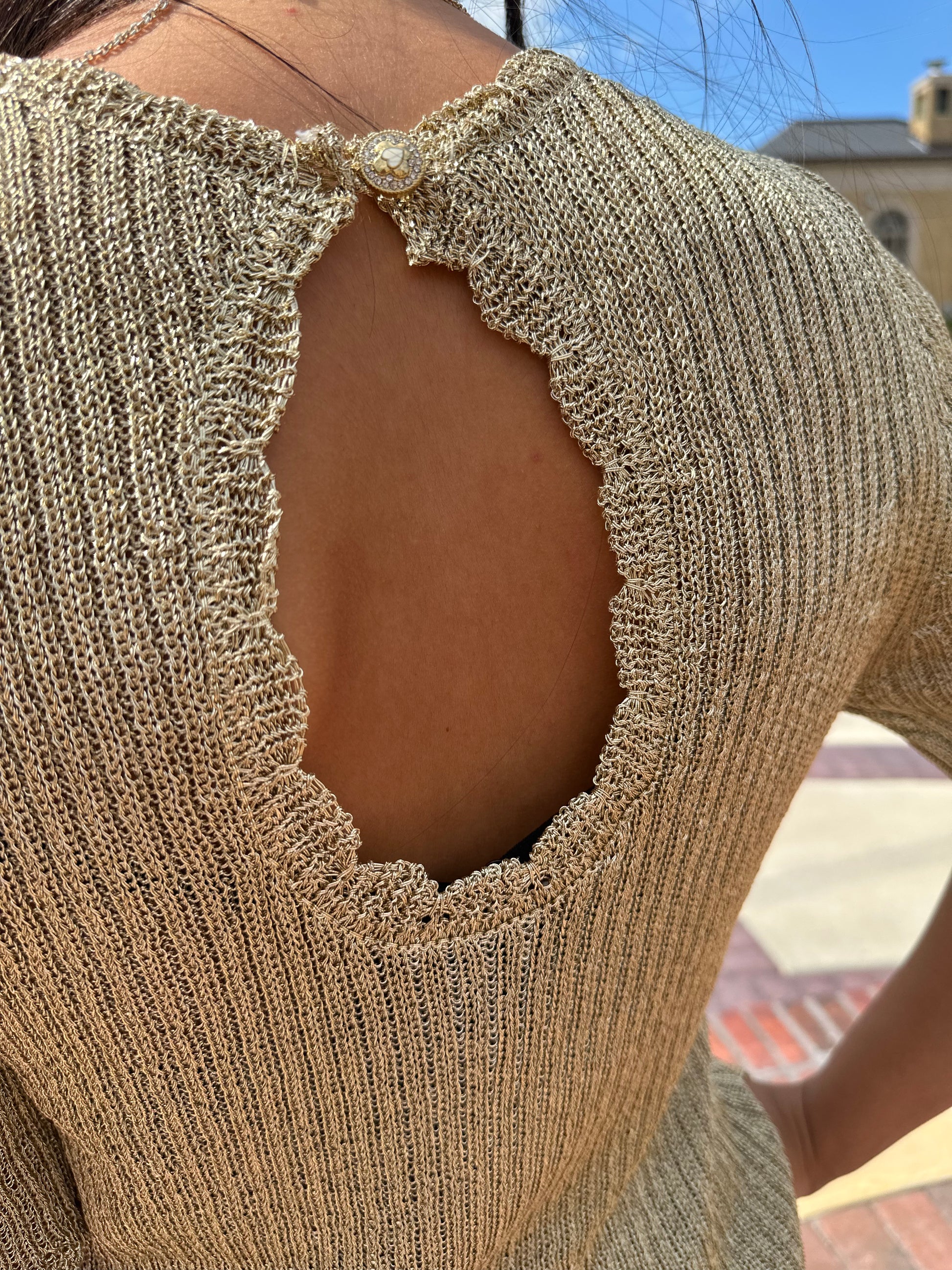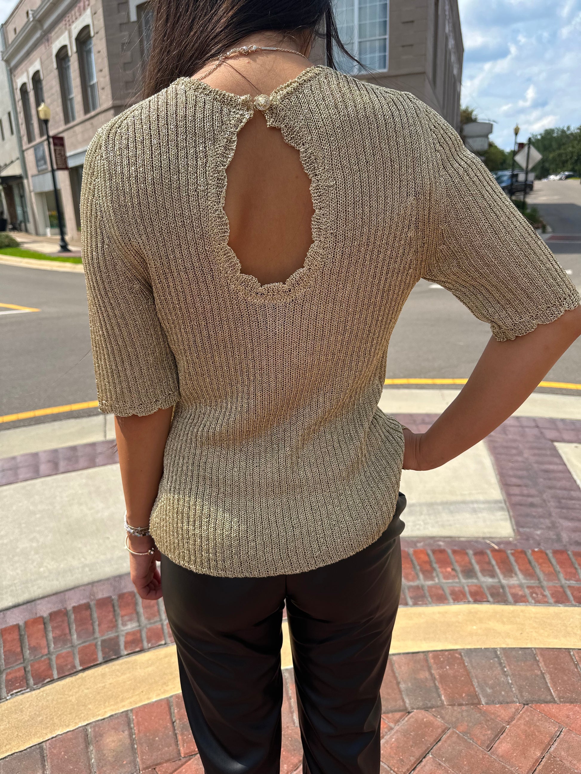 This luxe metallic knit top brings the perfect pop of glam to any outfit. The ribbed texture hugs in all the right places, while the scalloped keyhole back adds an unexpected touch of elegance. Finished with a delicate pearl button closure, it’s a look that turns heads—day or night. Style it with faux leather pants for an edgy twist or pair with denim for effortless chic.