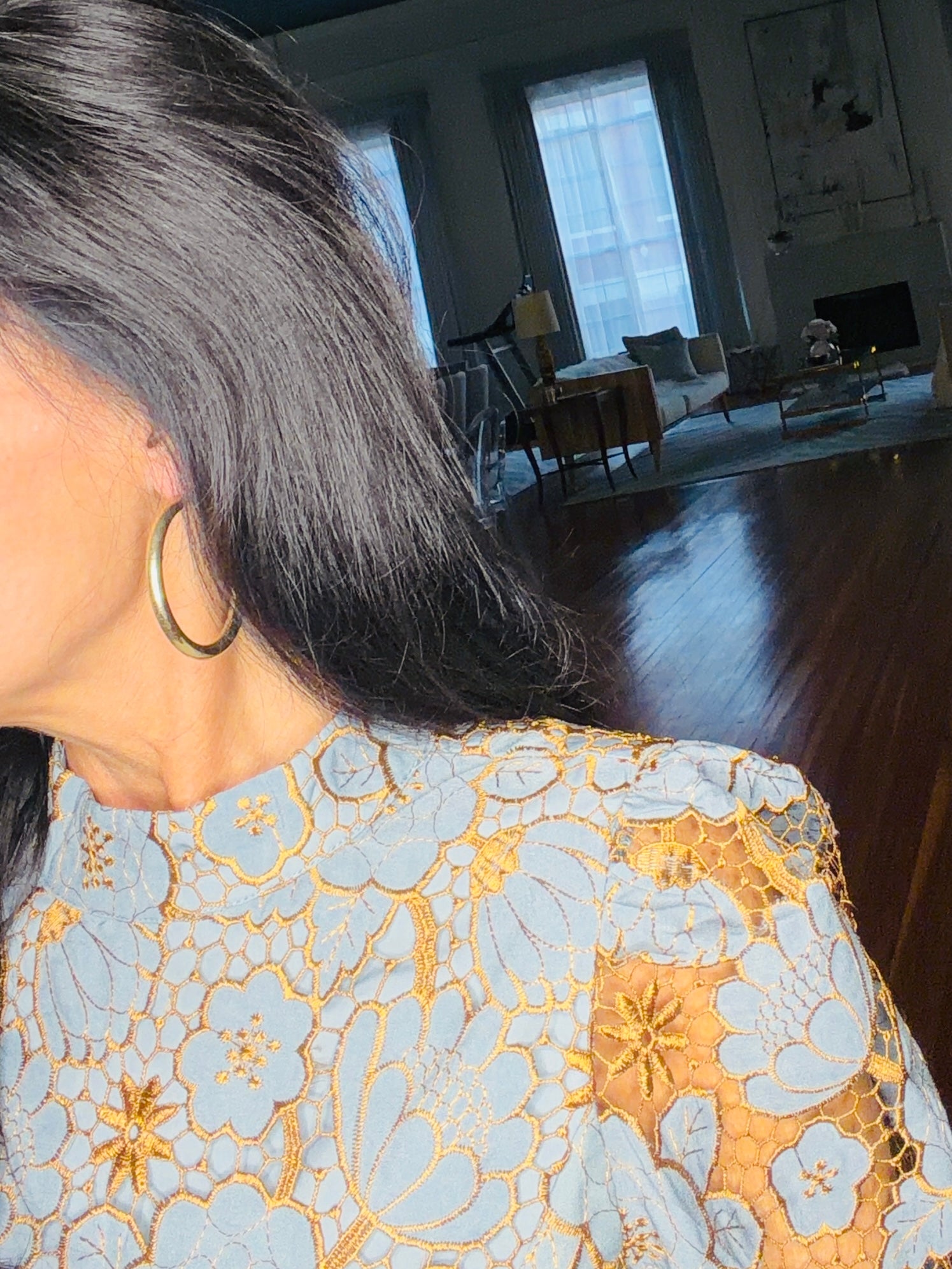 The Golden Hour Lace Dress is pure elegance with a touch of vintage charm. Featuring intricate golden floral lace layered over a soft slate-blue lining, this piece captures the light beautifully from every angle. The long sheer sleeves and high neckline add sophistication, while the tailored fit flatters your shape. Perfect for weddings, fall events, or any occasion where you want to make an impression
