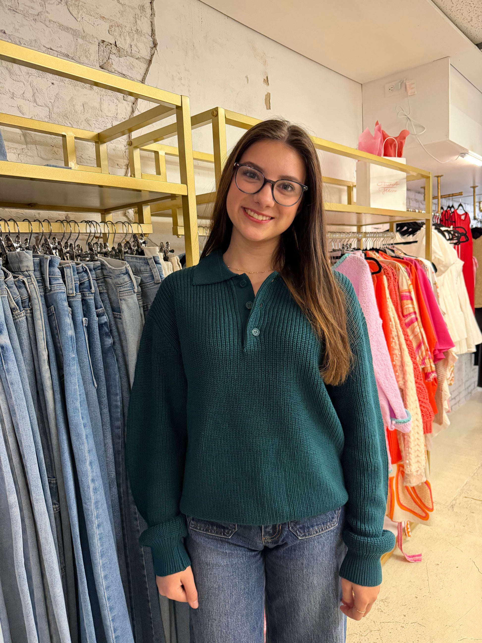 Cozy meets polished in this textured waffle-knit sweater. Designed in a rich hunter green, it features a relaxed silhouette with a fold-over collar and a classic three-button placket for an elevated, preppy touch. The soft, medium-weight knit makes it perfect for layering or wearing solo, giving you effortless comfort with a chic finish. Pair it with denim, trousers, or a skirt—this sweater is the versatile staple your winter wardrobe has been waiting for.