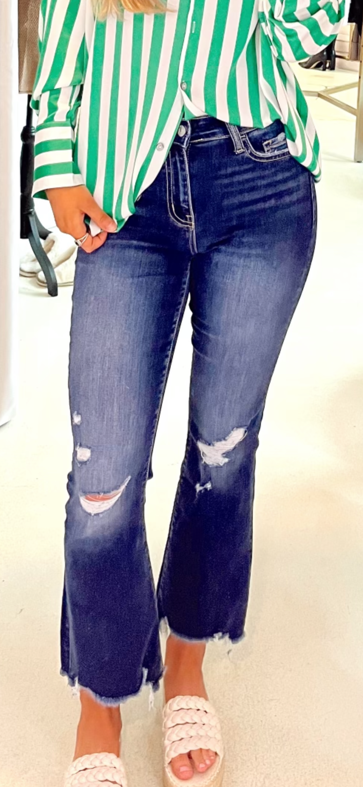 COMFORT STRETCH DENIM, HIGH RISE, CROPPED LENGTH, FLARE JEAN, DISTRESSED AND CUTE!