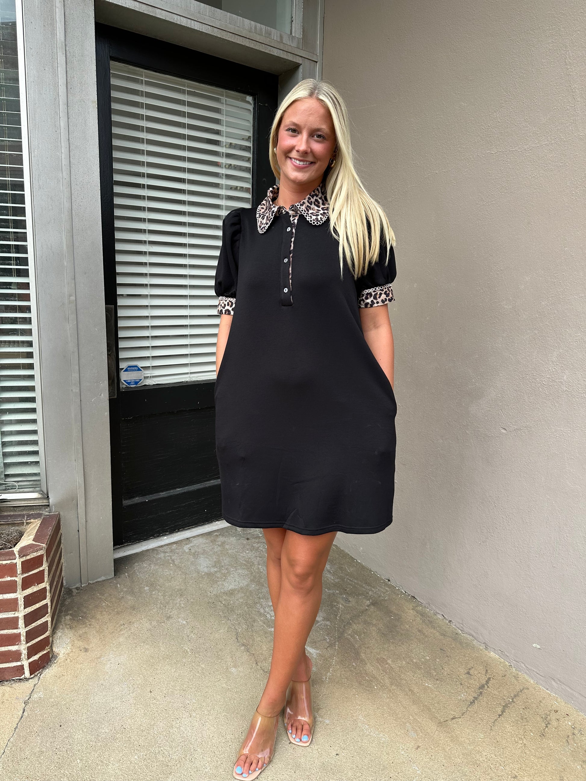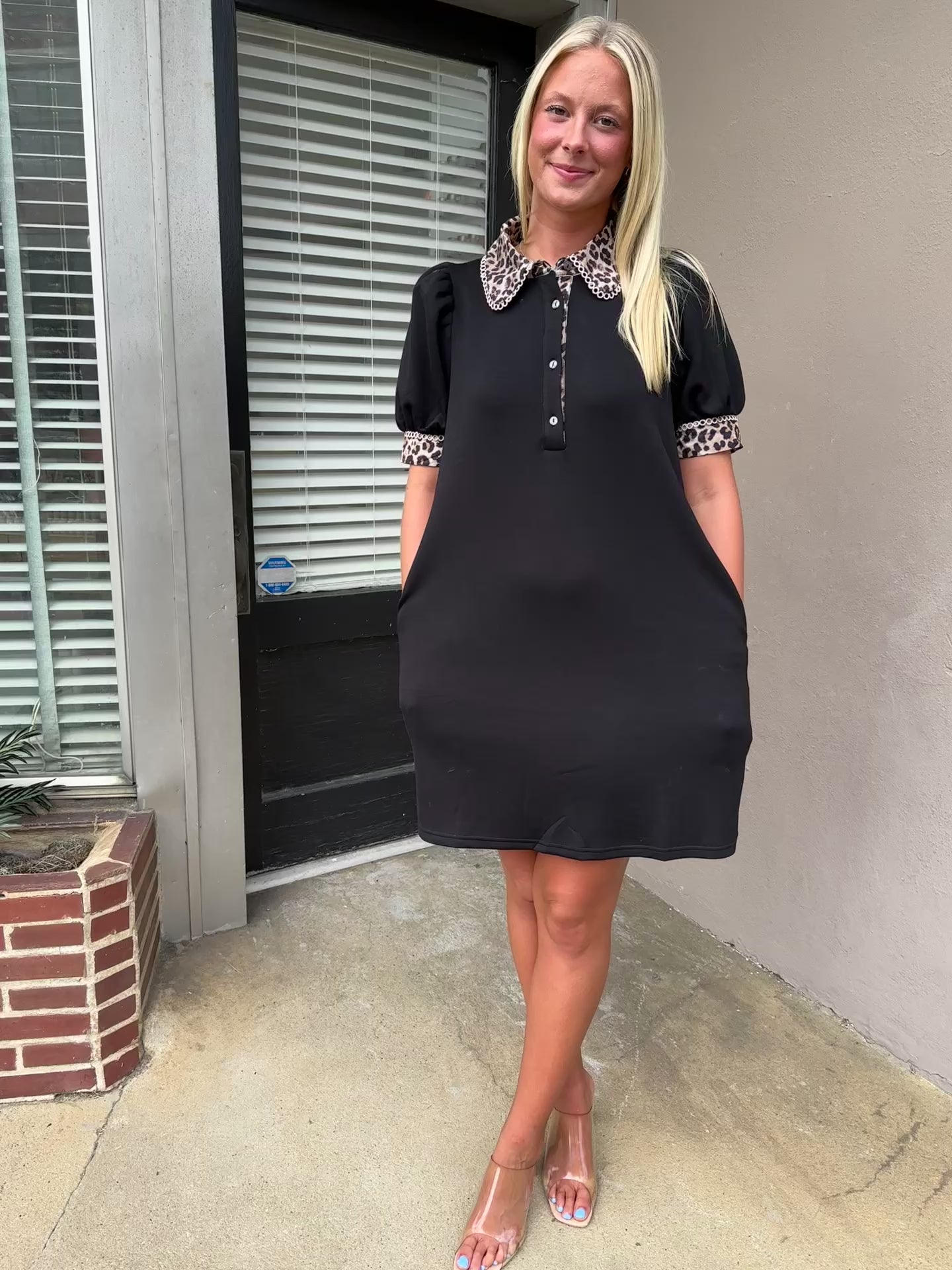 This dress features a chic black silhouette with a stylish leopard print collar, adding a fun twist to a classic design. The puffed sleeves offer a playful touch, while the button-up detail adds a hint of sophistication.