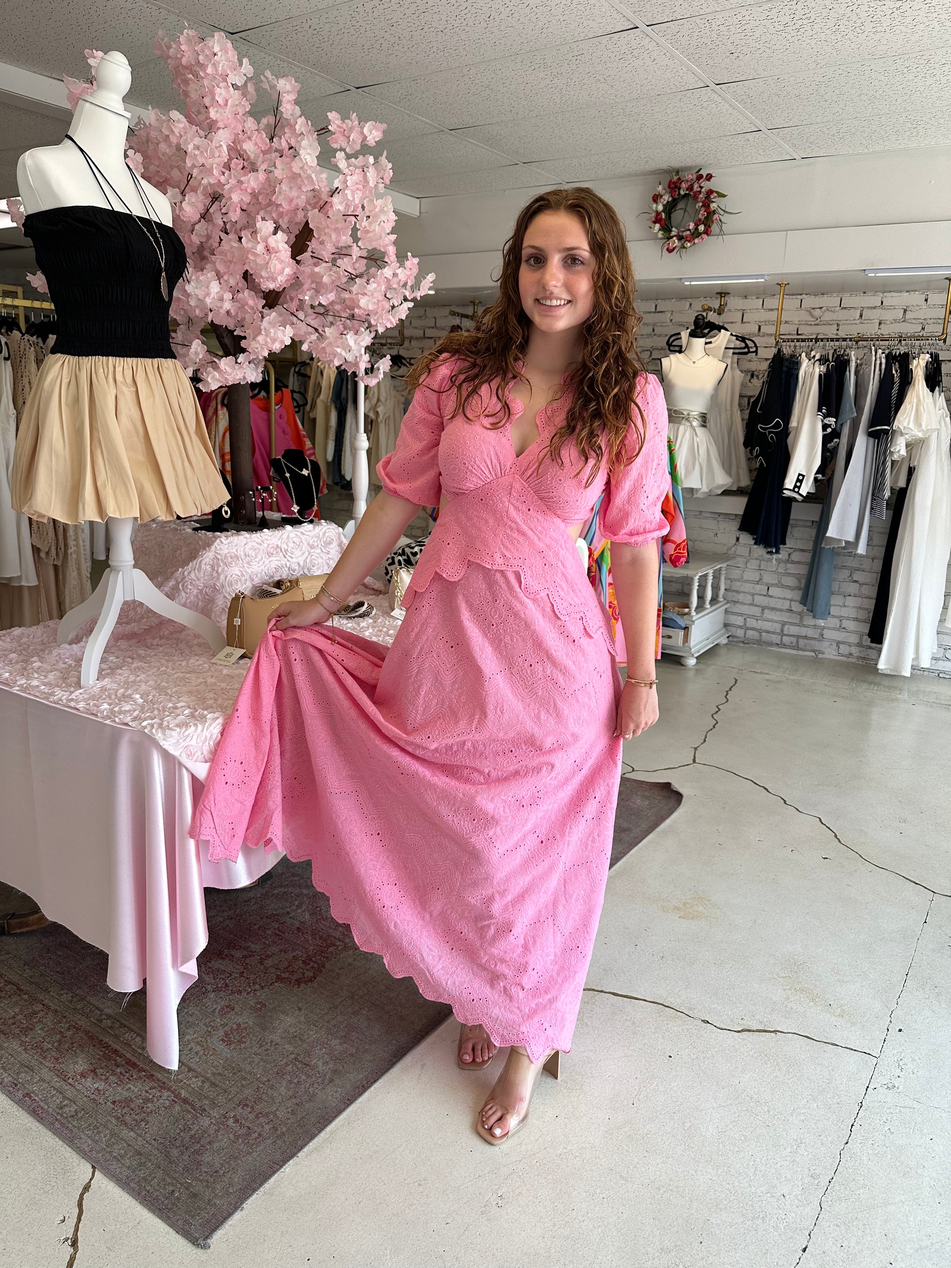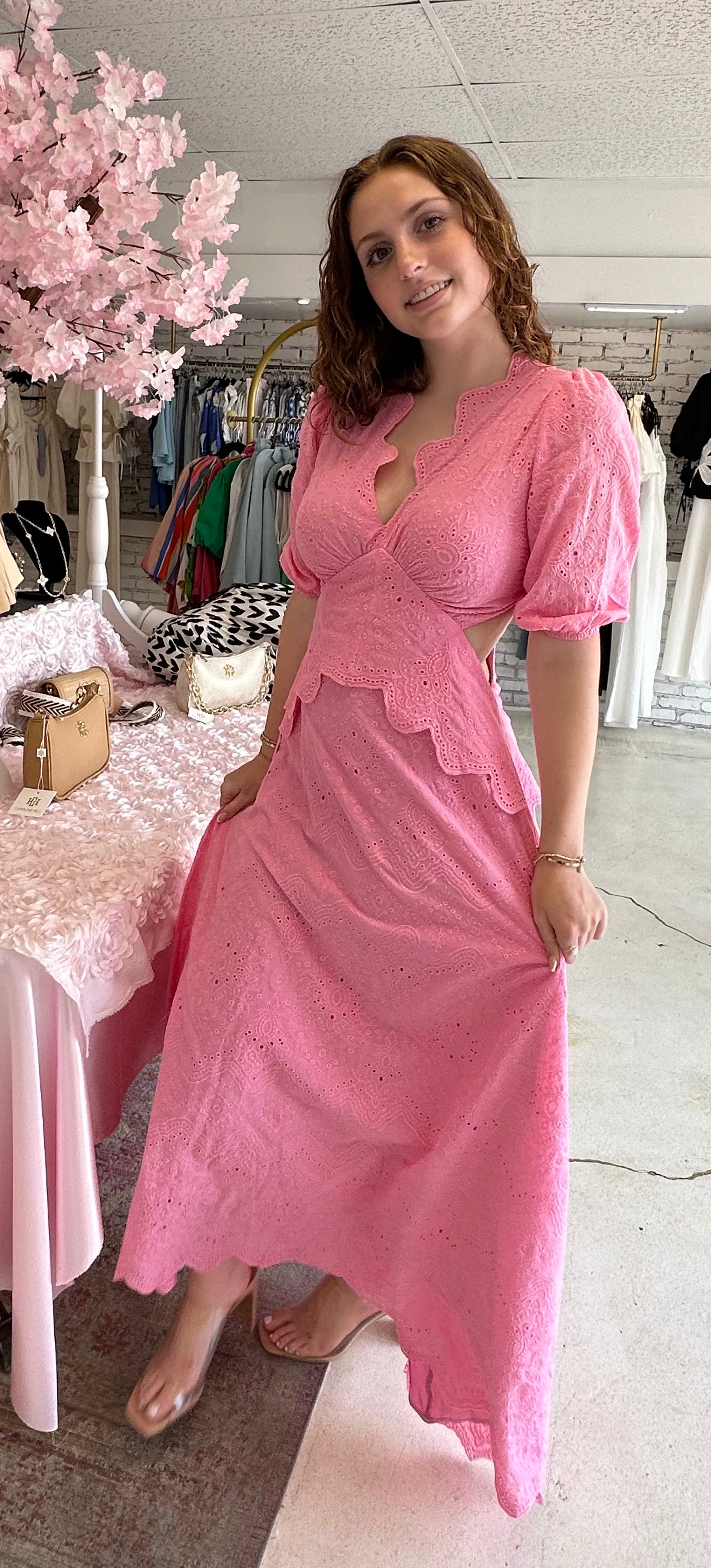 This is a beautiful shade of pink in an eyelet lace pattern. It has this gorgeous scalloped neckline and rim throughout. IT has cutouts on the sides and is a maxi length.