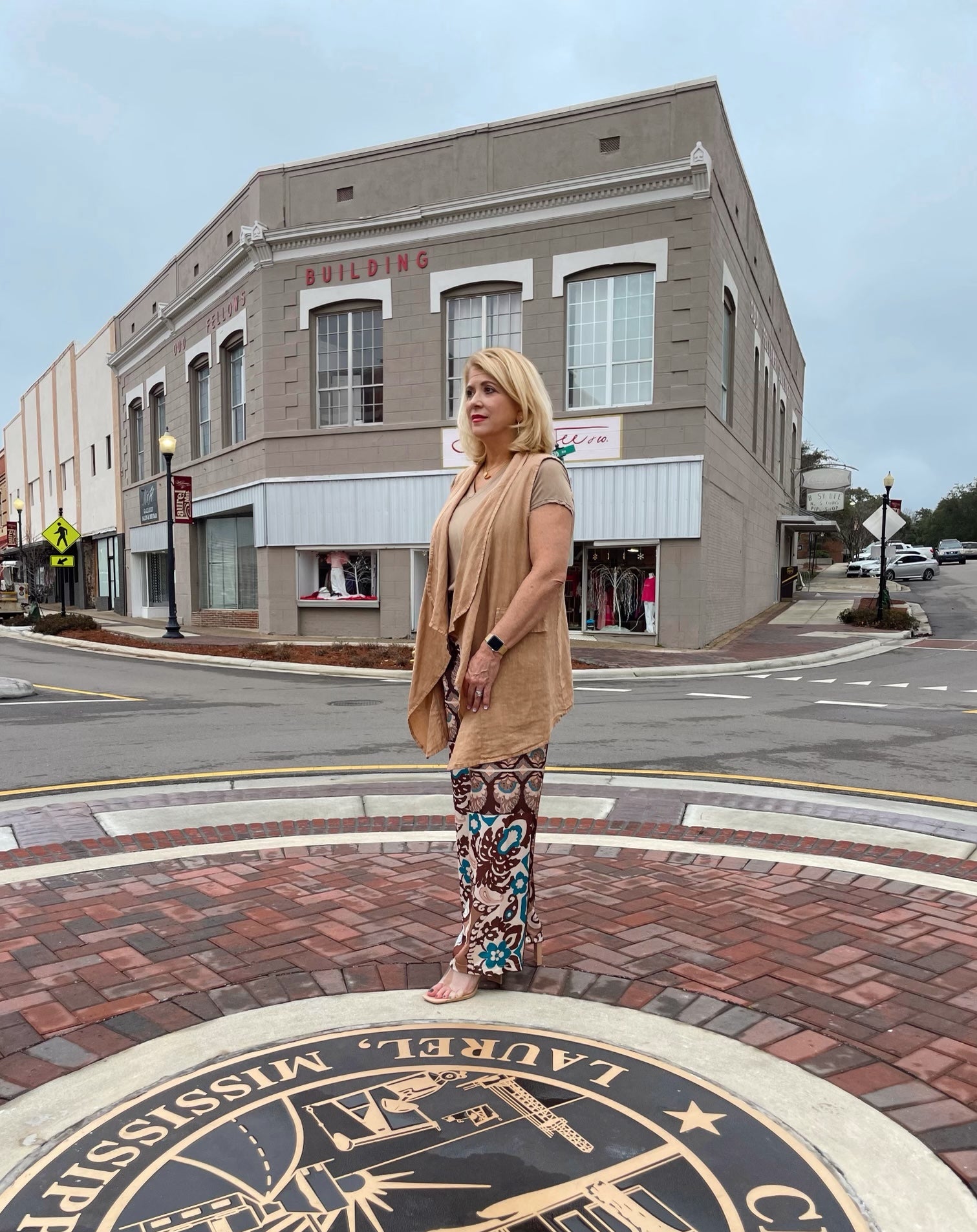 This is our long tunic style vest with draping sides and pockets, a beau caramel color that is perfect with our Bohemian Babe Pants.