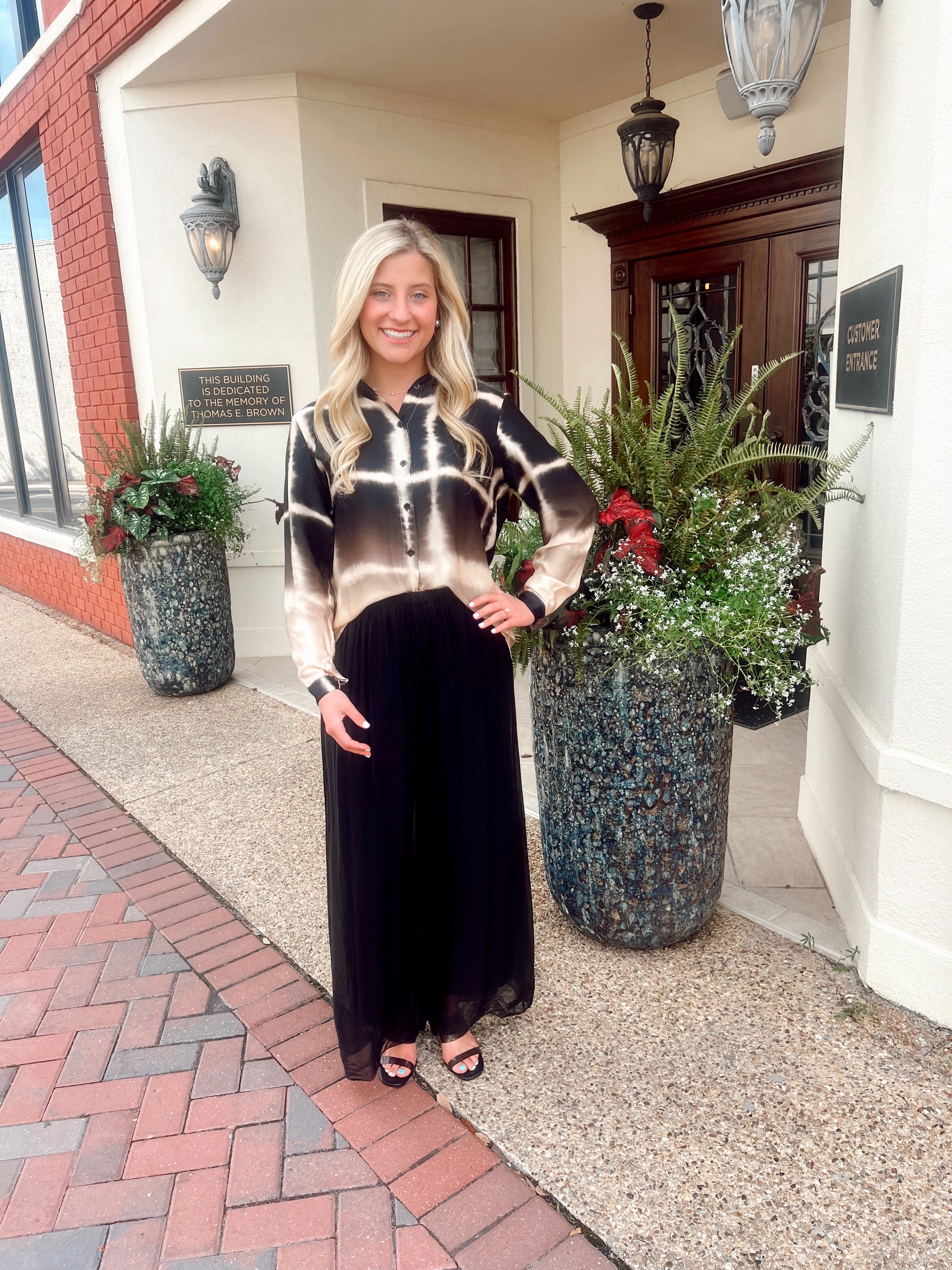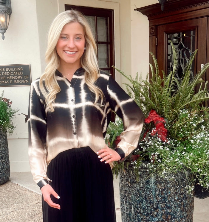 This is a beautiful silk,long sleeve button up in shades of the night moon. A gorgeous gold in black silk.